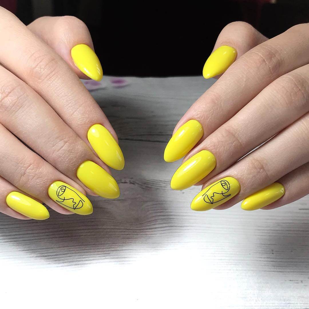 Несмотря на то, что ранее стиль минимализм в маникюре характеризовался черно-белым цветовым решением, сейчас все несколько иначе. В качестве основы или акцента все чаще можно увидеть самые разные оттенки и желтый — не исключение. Тем более, что оформление ногтей в данном цвете — наиболее подходящее решение для новичков. Яркие и незамысловатый дизайн — настоящий тренд 2020 года. Нарисуйте тонкие веточки, лимоны или ананасы, полоски или рисунок с точками в желтом цвете на прозрачном фоне. Будьте уверены, что такой маникюр точно не останется без внимания.