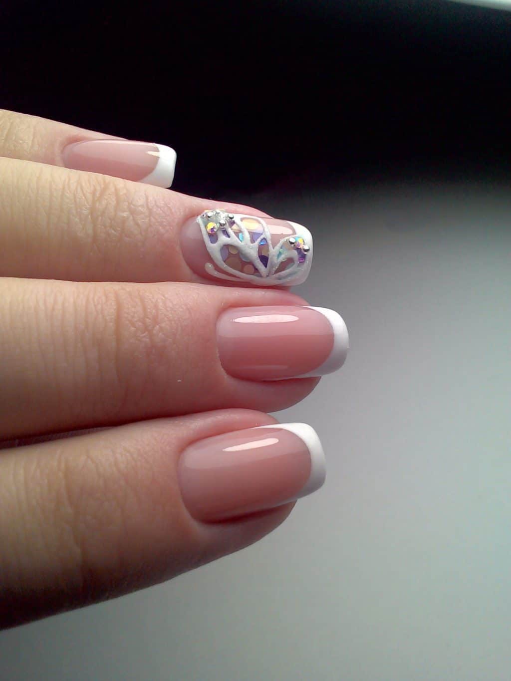 В последнее время становятся популярными очень красивые рисунки на белом гель-лаке, составленные из цветочков, бус, бутылочек с парфюмом, туфелек, сумочек, женских образов, элементов парижской тематики и т.д. Смотрятся они по настоящему свежо и оригинально. Однако выполнить их сможет не каждый мастер. Здесь нужен опыт и художественное воображение.