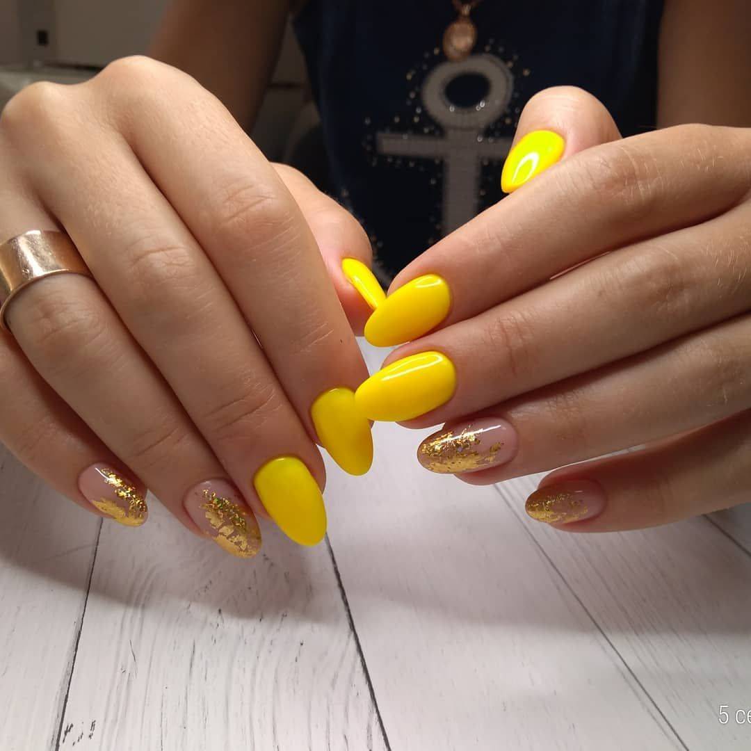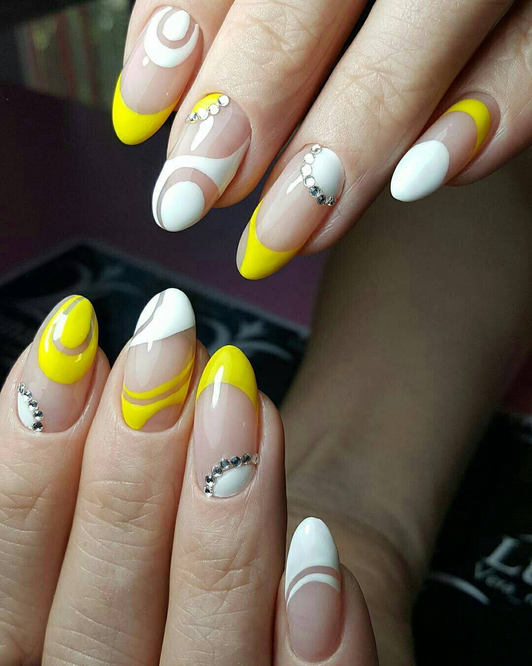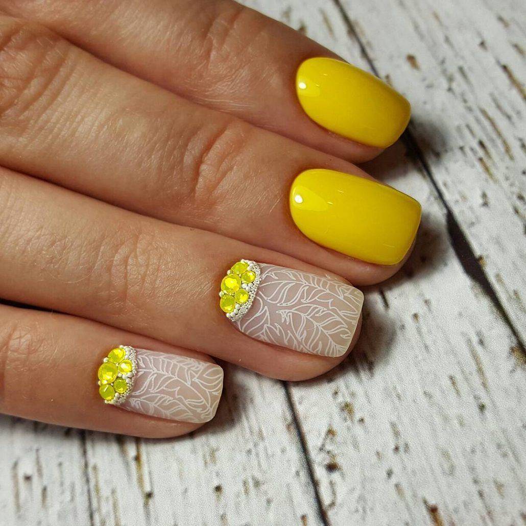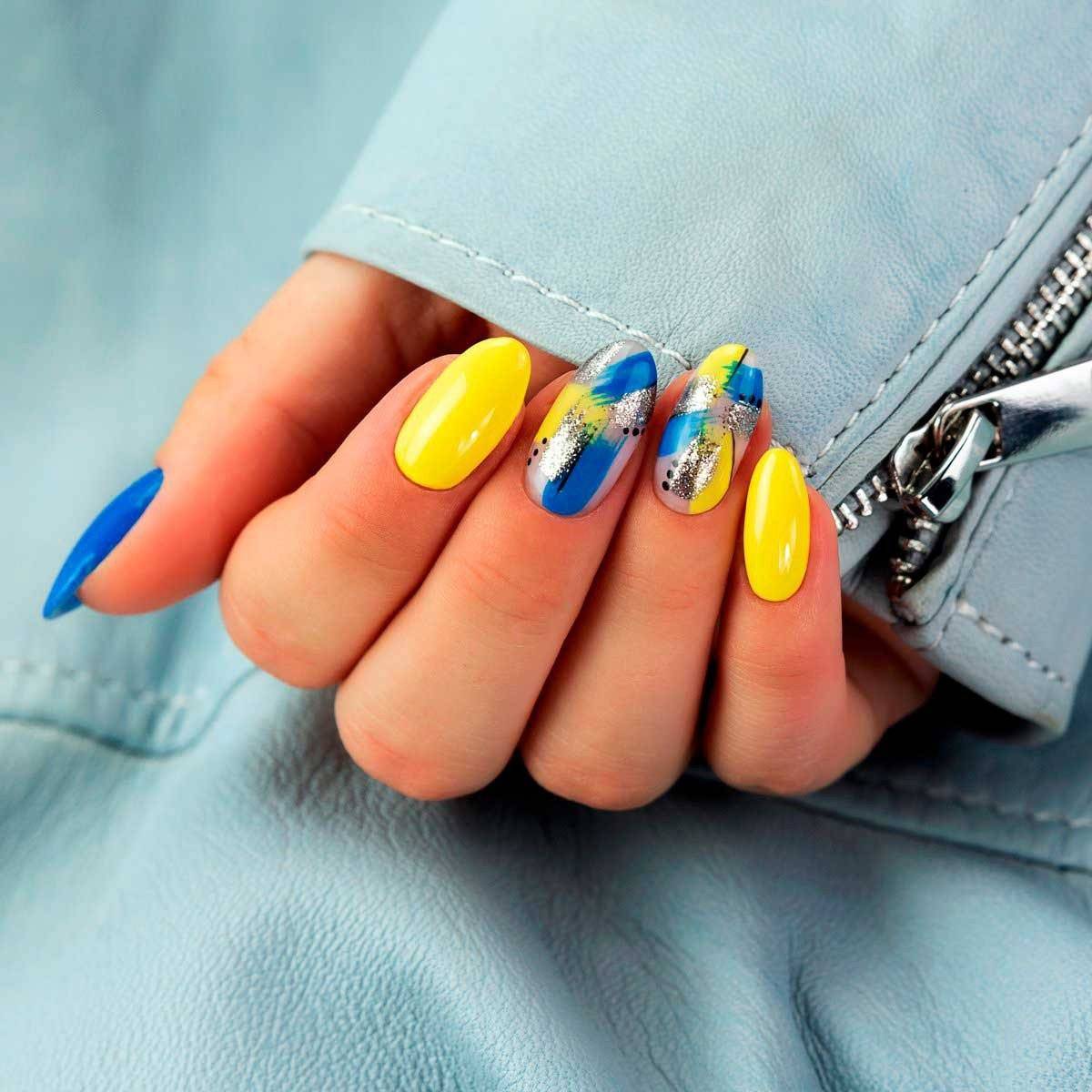 Если вы не любите конкретных изображений на ногтях, выбирайте абстракцию. Тем более, что желтое однотонное покрытие позволяет использовать большое количество оттенков для дизайна. Его наносят произвольно, просто смешивая краски