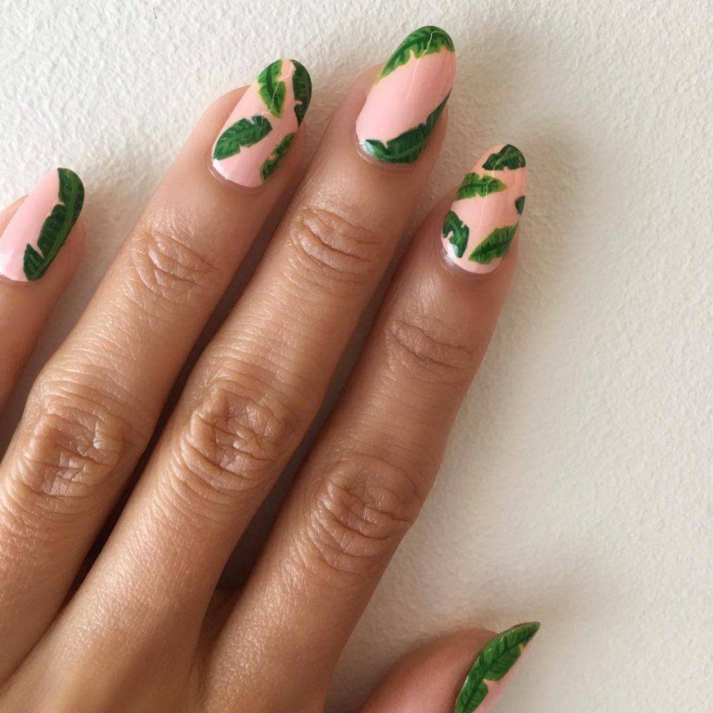 Лето — идеальное время для современного маникюра с тропическим принтом. Тем более, что вариантов существует довольно большое количество. К примеру, крупные зеленые листья в сочетании с геометрическими деталями, листва вместе с цветами и многое другое. Также их часто комбинируют с лунным маникюром, френчем и различными видами дизайна.