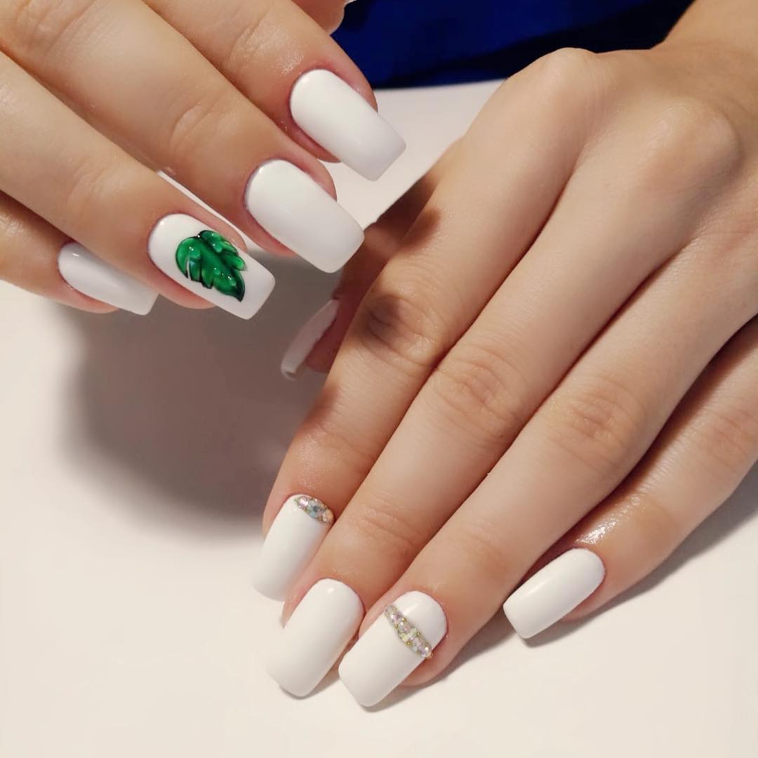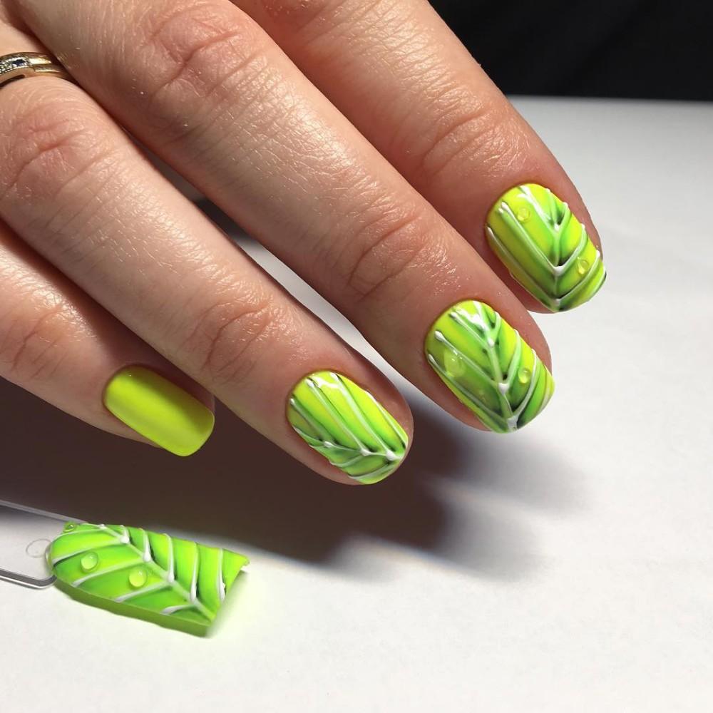 Обязательно попробуйте сделать самый модный маникюр 2020 года с тропическим принтом. Вариантов может быть несколько: сочетание зелени и геометрических форм черно-белого цвета, зелень и полоски, зелень и блестки или втирка, листва нарисованная на камуфляже.