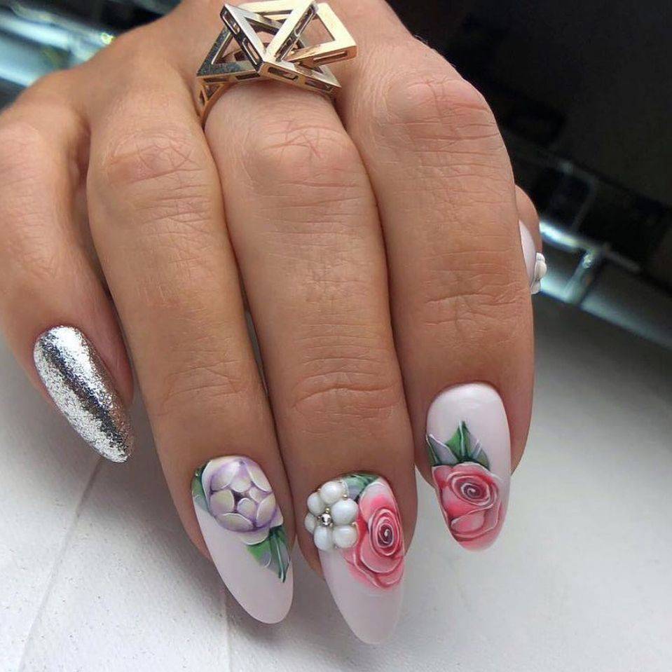 Также остается на пике популярности. Розы и некоторые другие цветы будут смотреться на ногтях не только актуально, но и очень красиво. При этом цветы могут быть как нарисованы, так и наклеены на ноготь.