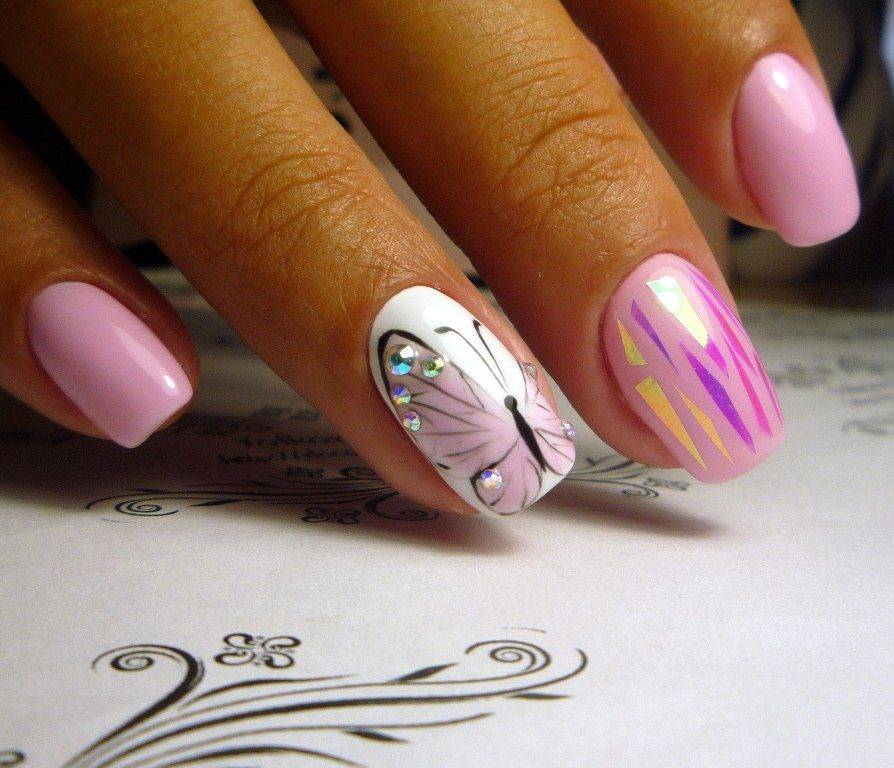 Именно этот рисунок отражает легкость жарких летних дней. Чаще всего его наносят вручную с помощью набора красок и тонких кистей. Это позволяет тщательно прорисовать все детали на крылышках, которые и помогают создать необходимый эффект. В некоторых случаях для этого можно использовать наклейки или выложить бабочку из страз. Конечно же, дизайн получится достаточно крупным, объемным, что не всегда удобно в повседневной жизни.