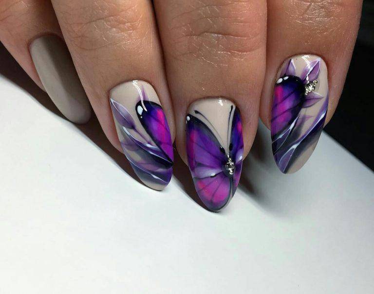 Именно этот рисунок отражает легкость жарких летних дней. Чаще всего его наносят вручную с помощью набора красок и тонких кистей. Это позволяет тщательно прорисовать все детали на крылышках, которые и помогают создать необходимый эффект. В некоторых случаях для этого можно использовать наклейки или выложить бабочку из страз. Конечно же, дизайн получится достаточно крупным, объемным, что не всегда удобно в повседневной жизни.