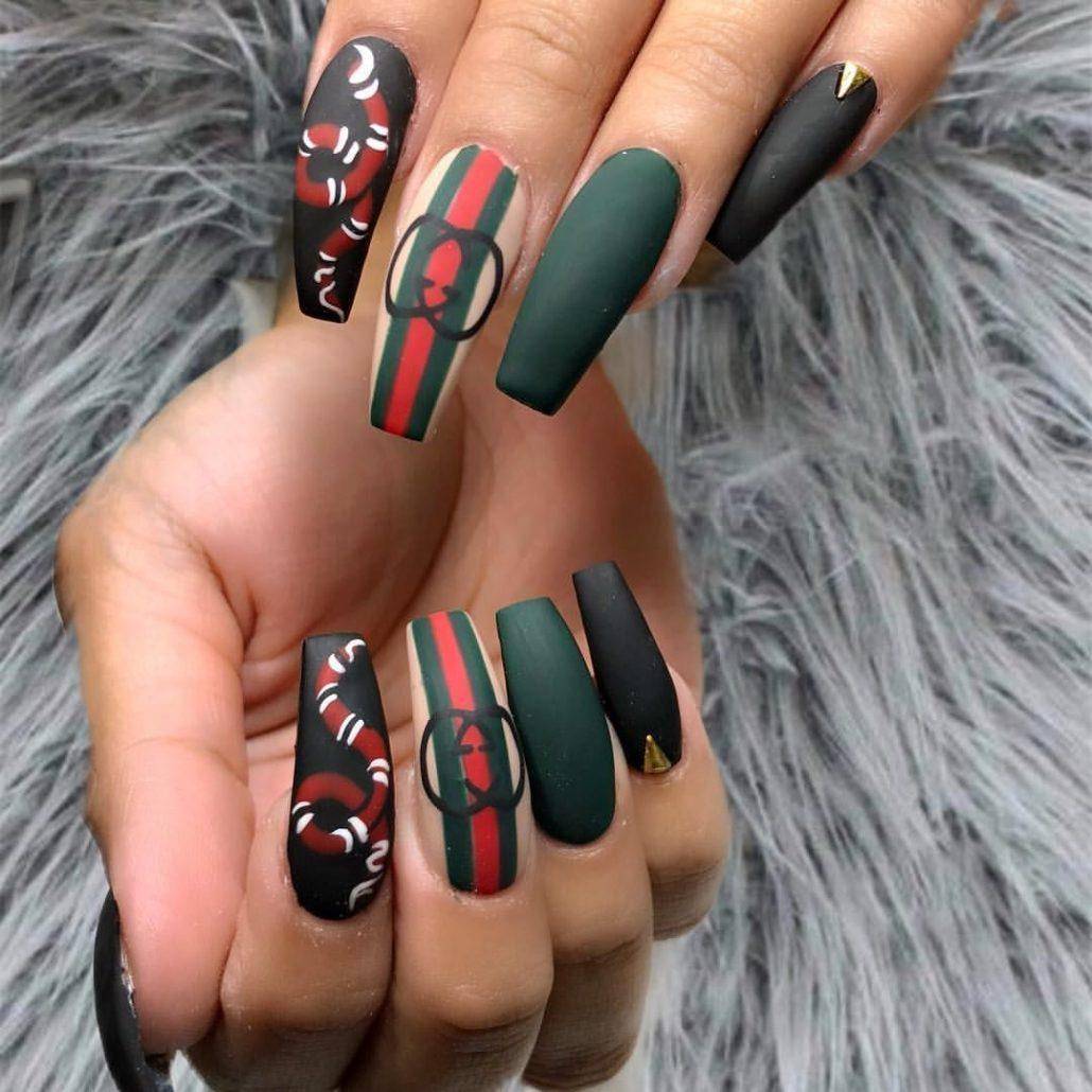 Очень эффектно выглядит на длинных ногтях 3D рисунок, который имитирует кожу рептилии. Аккуратные чешуйки наносят при помощи гель-лака или рисуют акриловыми красками, используя разные оттенки. Также на длинных ногтях очень актуально выполнять модный и стильный дизайн в стиле Gucci.