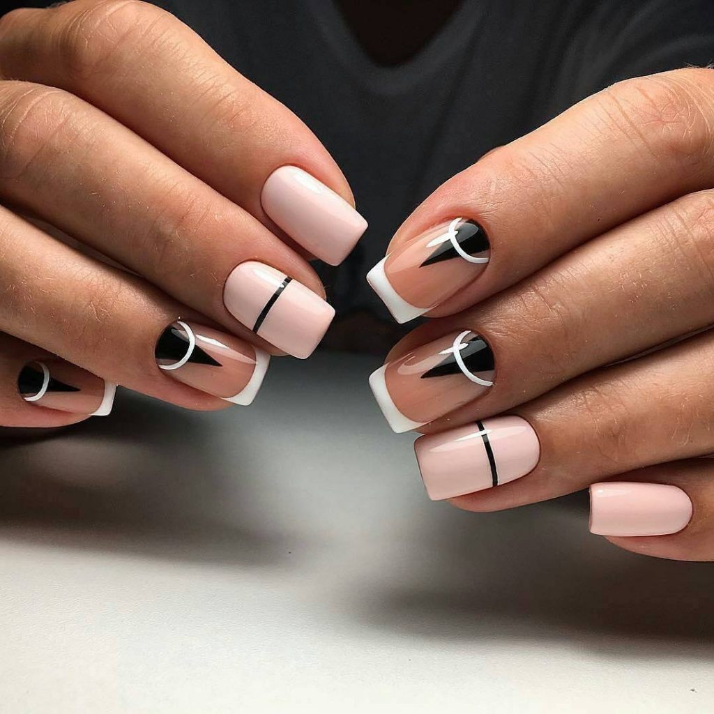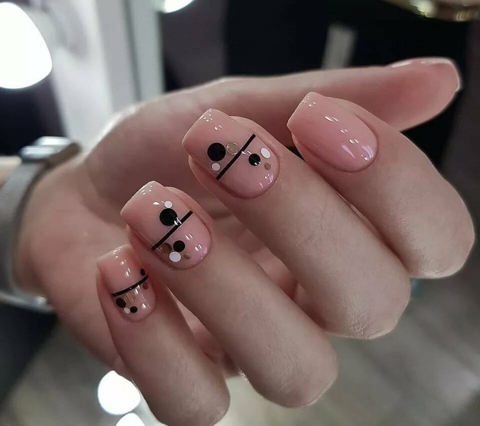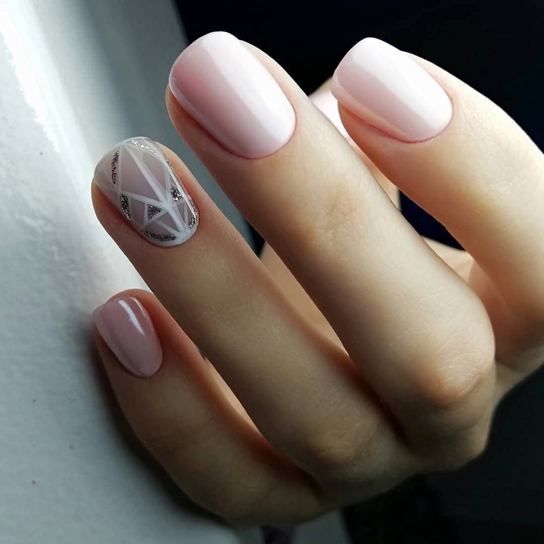 Разнообразить сдержанный вариант можно с помощью минималистичных геометрических рисунков, плавного градиента или лунного маникюра.