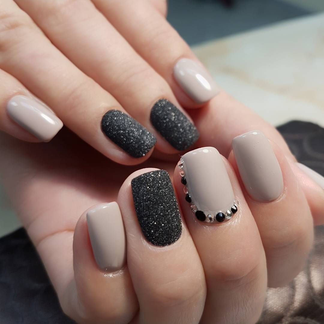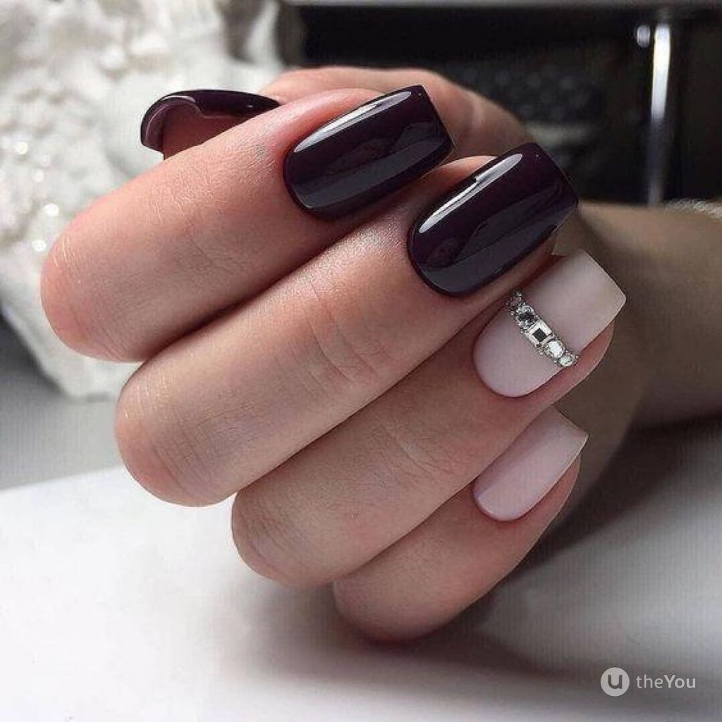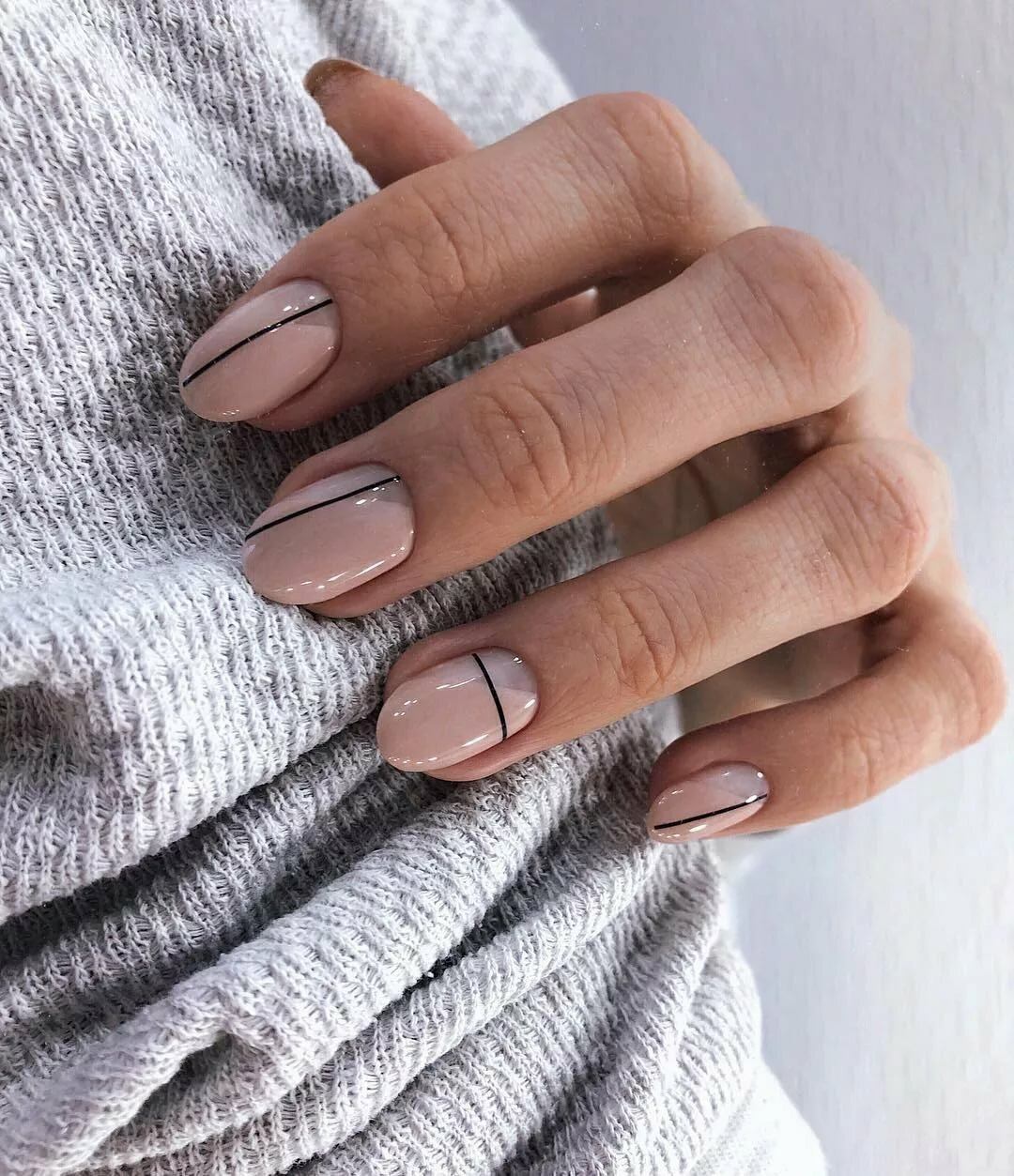 Разнообразить сдержанный вариант можно с помощью минималистичных геометрических рисунков, плавного градиента или лунного маникюра.