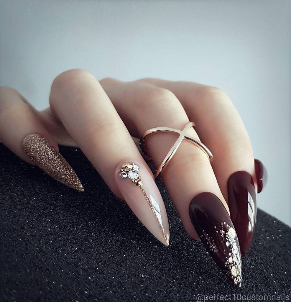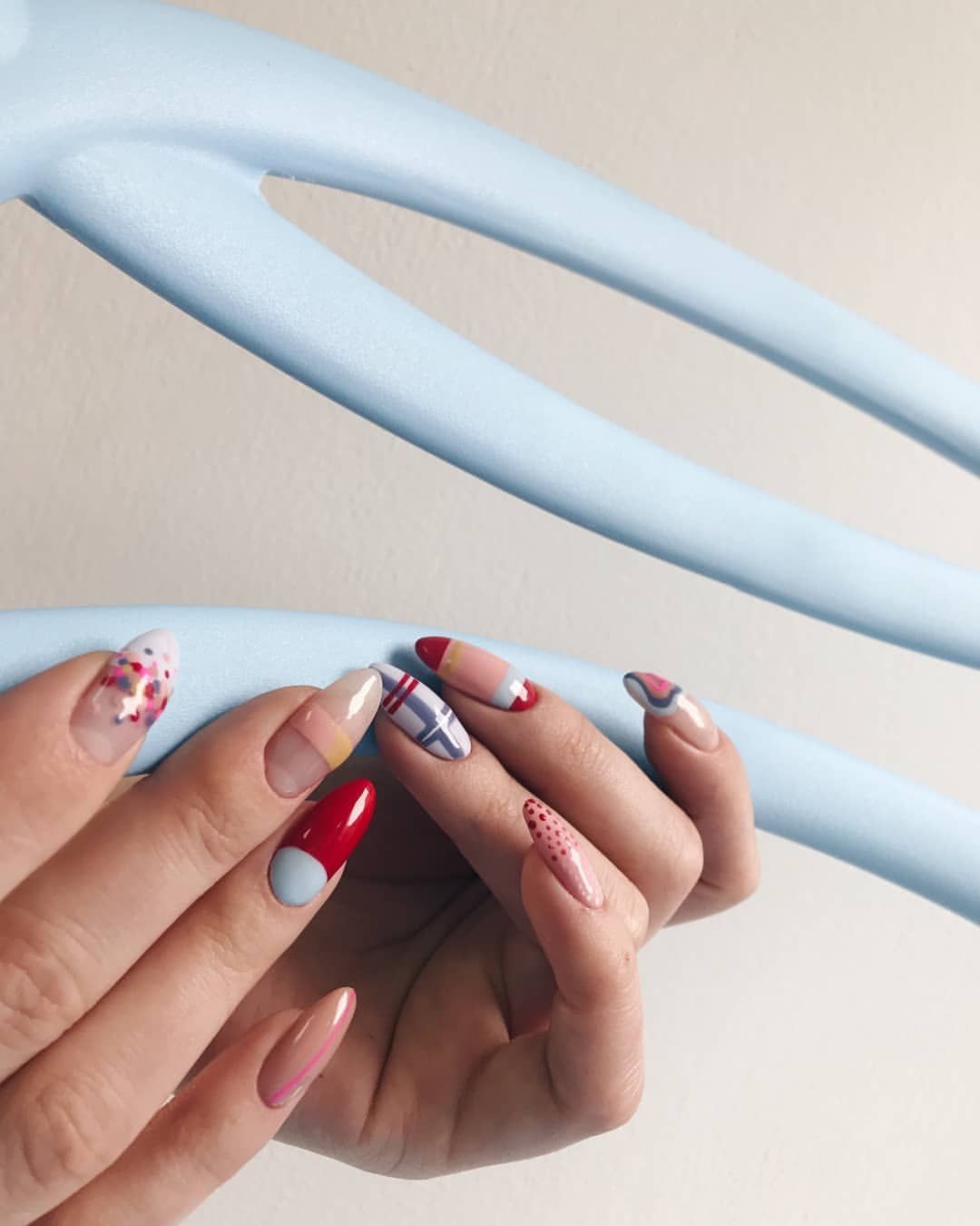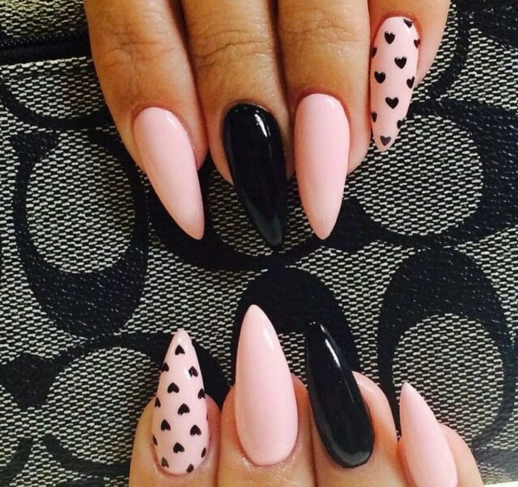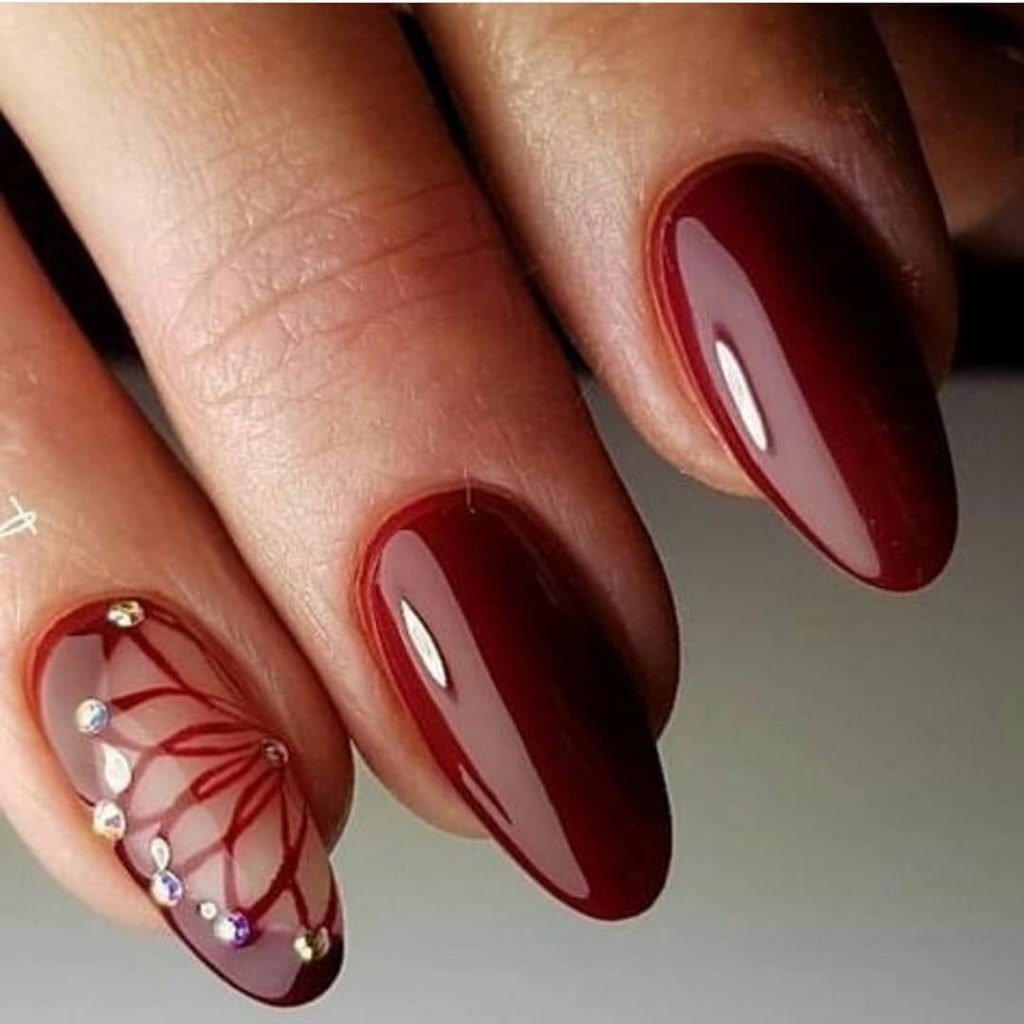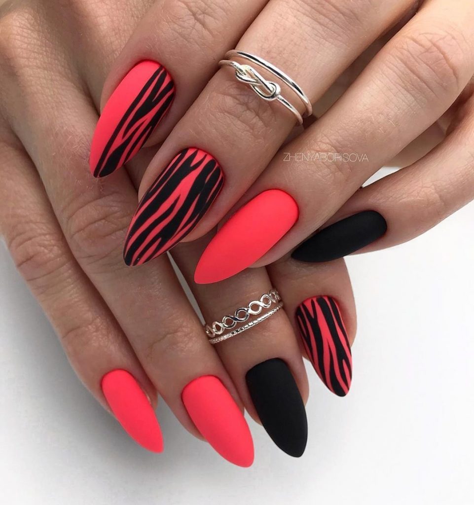 Красный всегда был признаком страсти, гармоничен с однотонным и на острой форме. Добавляют элегантную изюминку ажурные узоры, либо черная паутинка.