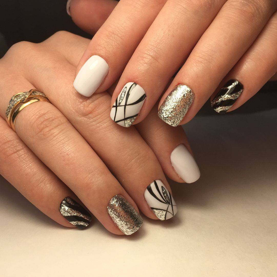 Простая и сдержанная геометрия прекрасно подойдет для создания стильного, но в то же время не броского нейл-арта. Если с умом подойти к выбору дизайна, то можно зрительно сузить и удлинить ногтевую пластину. С этой ролью отлично справится принт в виде тонких вертикальных полос контрастного цвета. Не менее интересно будет выглядеть дизайн, созданный с использованием блестящих золотых или серебряных декоративных элементов.