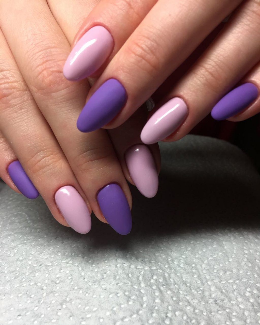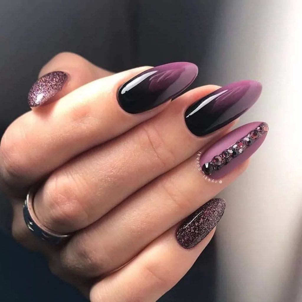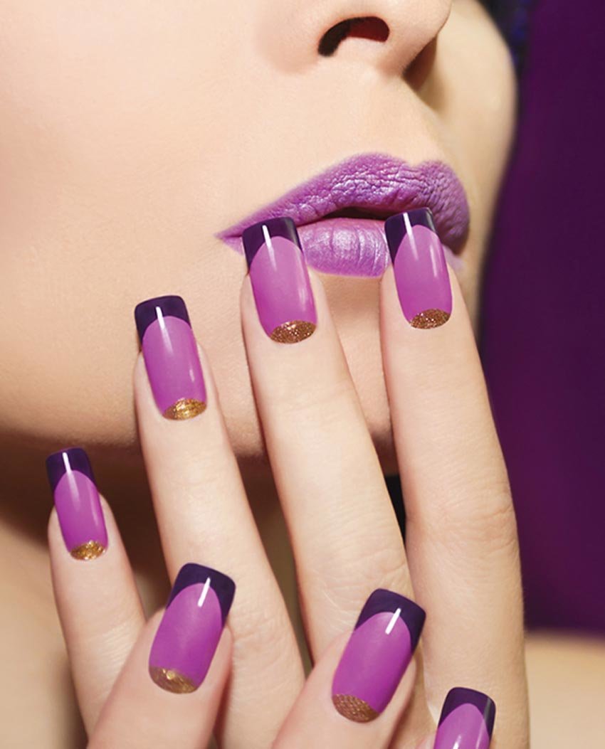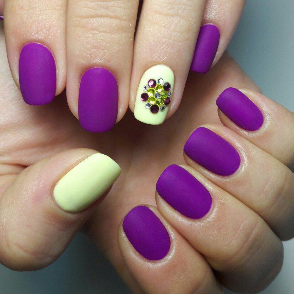 Фиолетовый — глубокий цвет, подходящий под тёмные тона. Экстравагантен под матовым покрытием. А декорировать его лучше небольшими рисунками, либо втиркой под тон. Иначе фиолетовый попросту «съест» эффект.