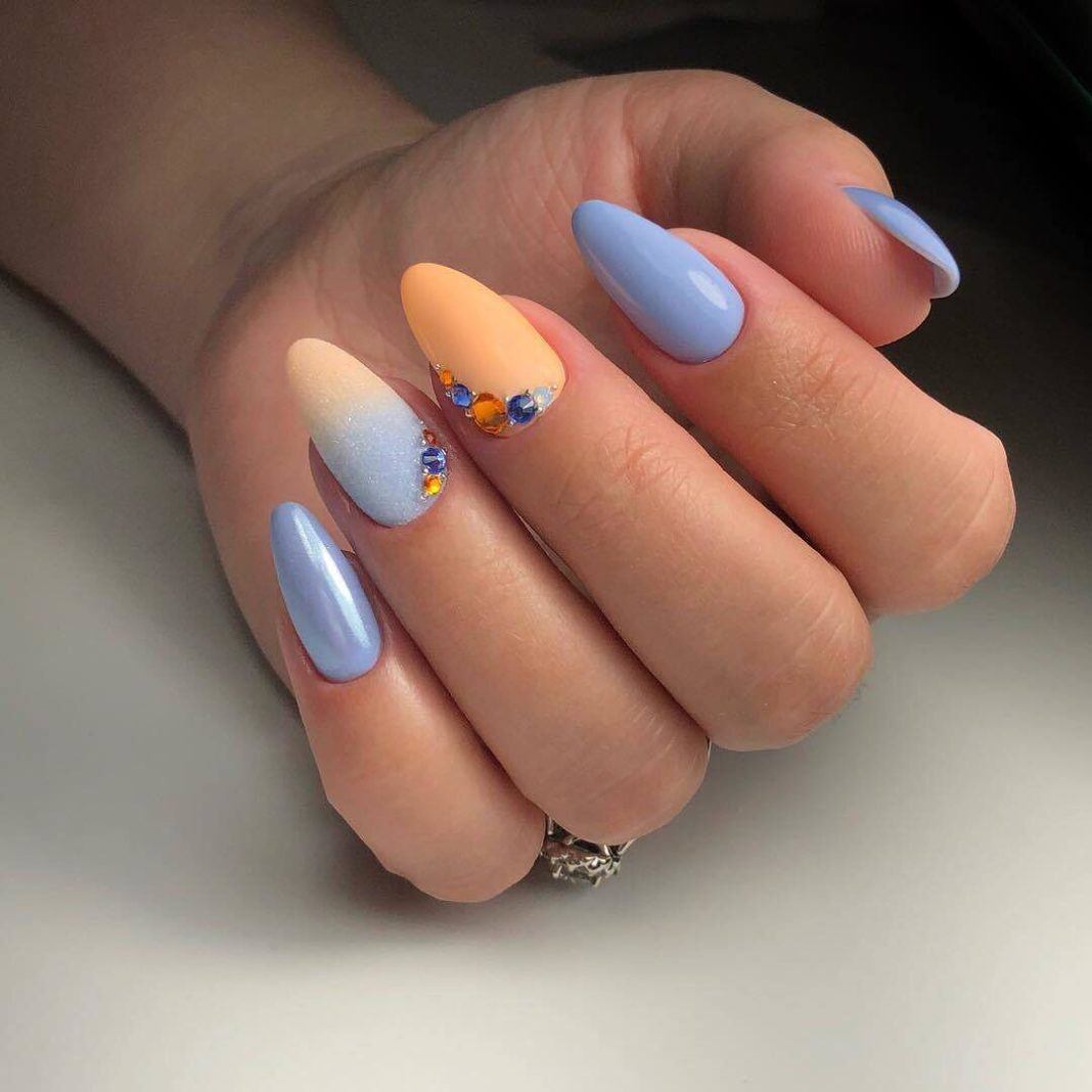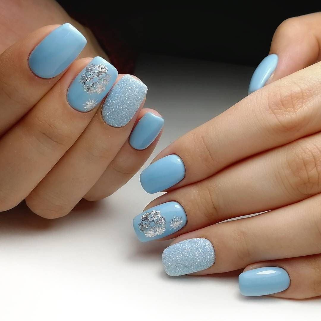 Голубой относится к пастельной гамме, изумительно смотрится в технике градиента и разводов. Дополняют цветочками, либо блестящей втиркой.