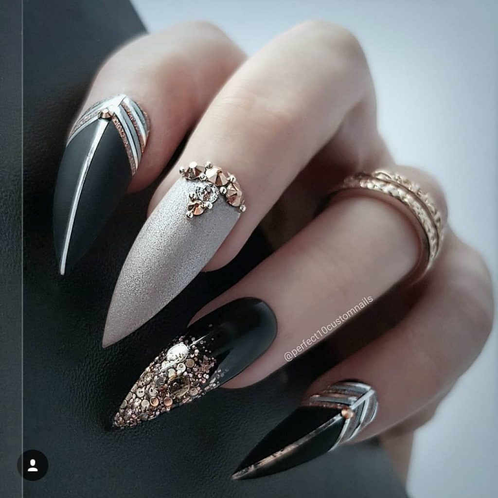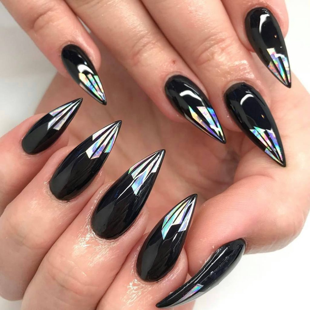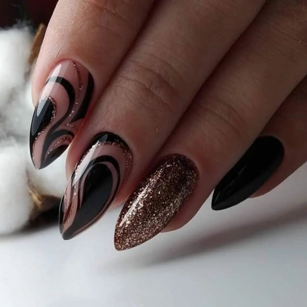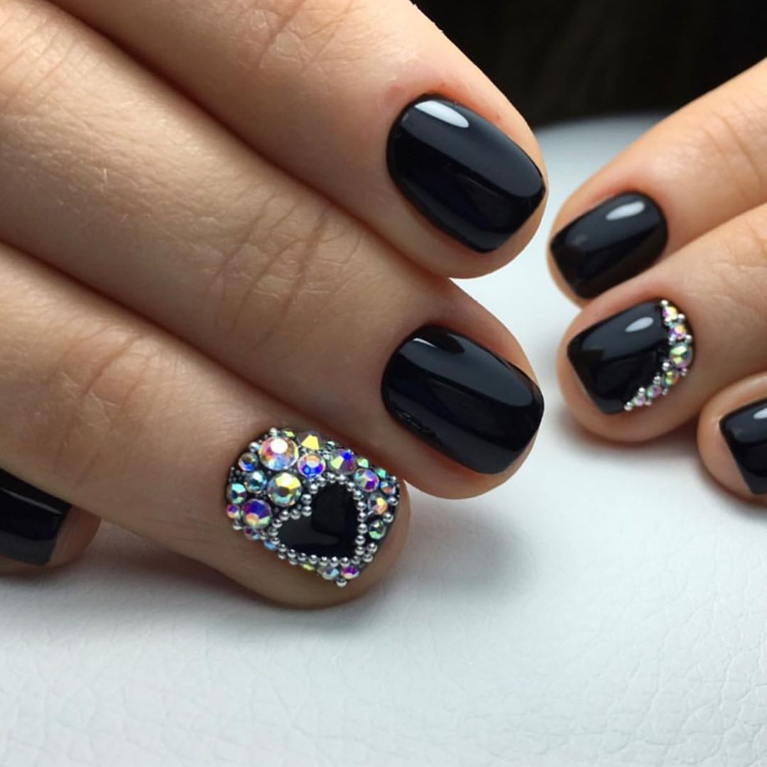 Сдержанный чёрный несомненно выглядит невероятно стильно. Сочетают как с прозрачной основой, так и исполнять в тоне френч. Дополнять узорами из серебряных, либо золотистых линии или глиттеров.