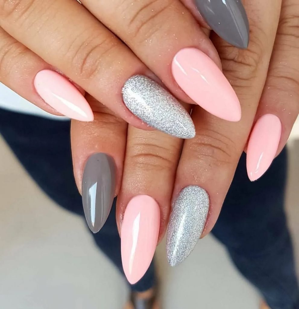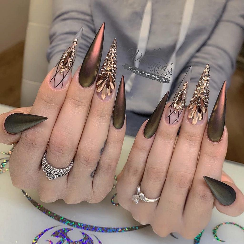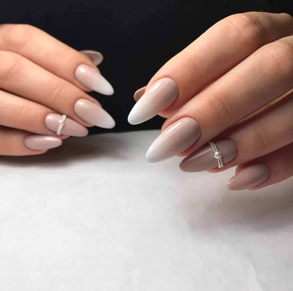К примеру, сдержанное покрытие пастельных тонов дополняют кончиком, украшенным металлической втиркой.