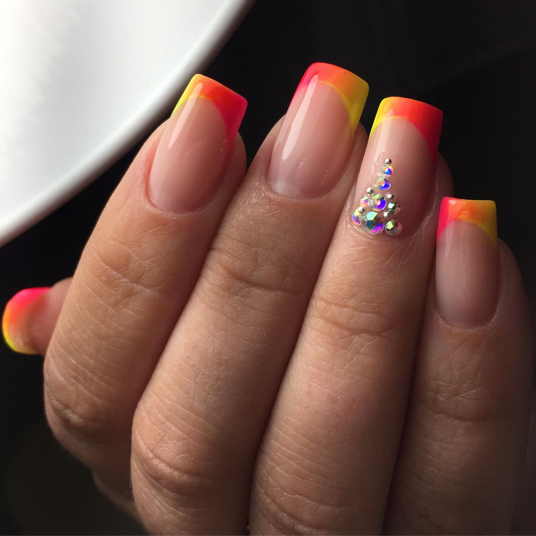 Привлекательный молодежный дизайн получают при нанесении французского нейл-арта в молодежном стиле. На кончиках ногтей делают полосатый френч в ярких тонах. Такой маникюр отличается минимализмом и изящностью.