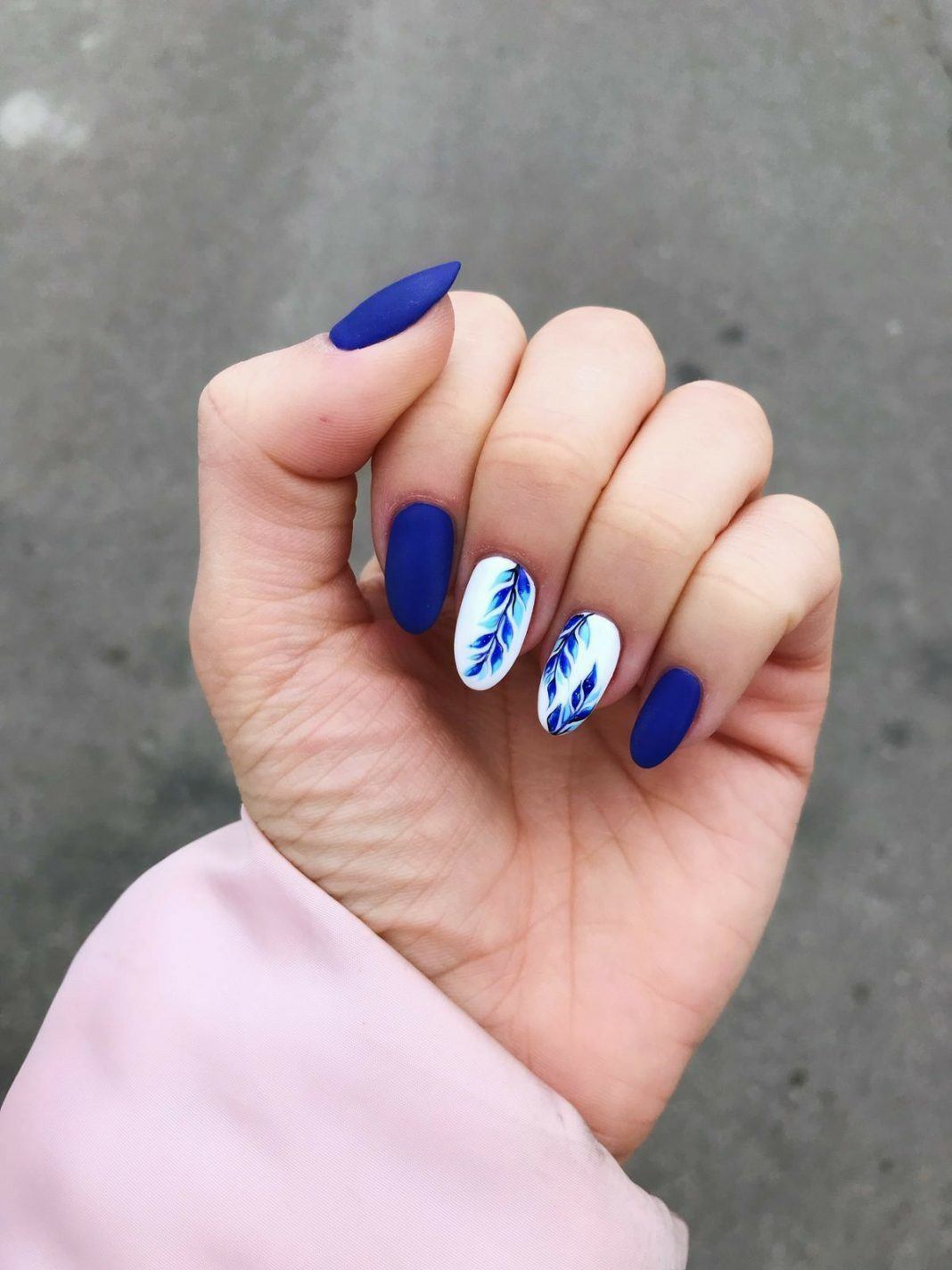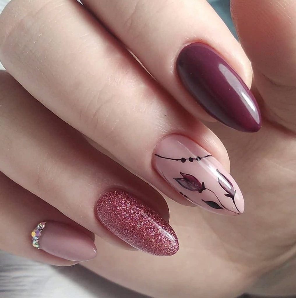 Новинкой сезона будет маникюр с нарисованными тонкими линиями веточками. Рисунок может размещаться на трех ногтях одной руки. В качестве базового цвета подойдет мятный или персиковый. Можно использовать светло-серый оттенок. Этот дизайн подойдет для весенних и осенних луков.