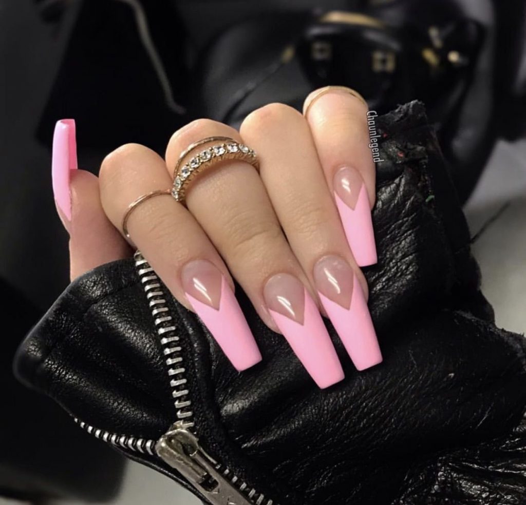 Суть такого дизайна заключается в том, чтобы покрыть пластину цветным лаком в центральной части ногтя, оставив края около боковых валиков непокрашенными. Такой подход позволит зрительно удлинить ноготь, придать рукам аккуратности и изящности.