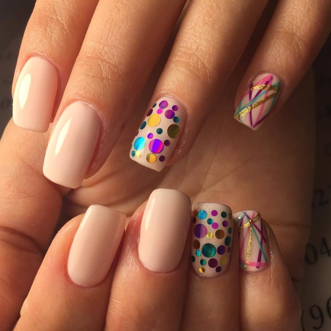 В результате дизайн ногтей получается в виде контрастной россыпи мелких точек разного цвета. Когда будет приобретен достаточный опыт, количество цветных лаков можно увеличить с 2 до 3-4.