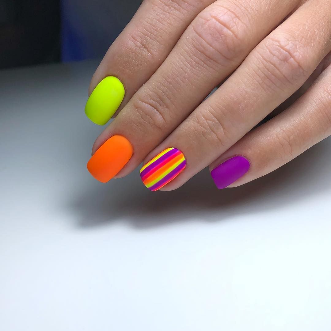 Очень эффектно смотрится полосатый маникюр. Можно использовать все цвета радуги, а также дополнить прямые линии уникальными изгибами.