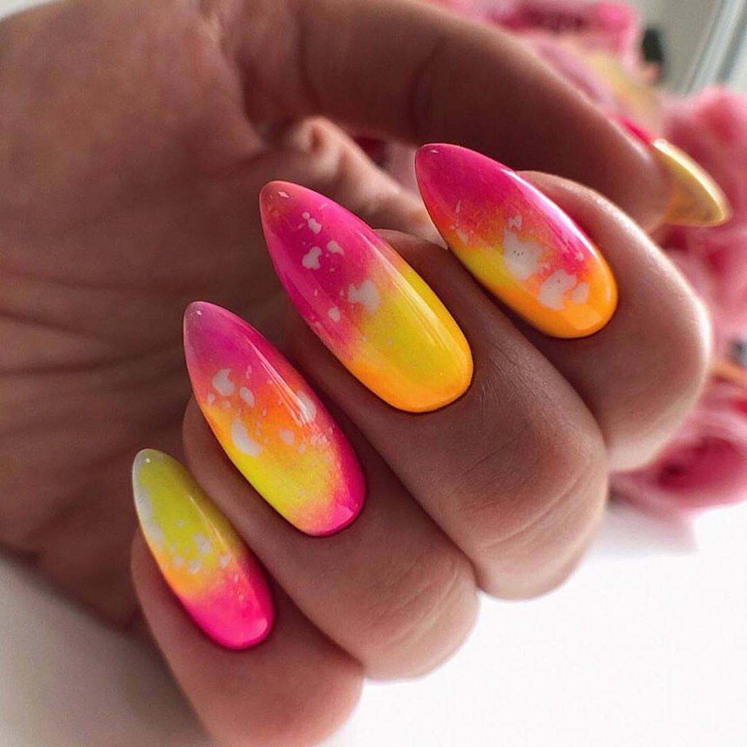 Модный молодежный тренд – дизайн маникюра «негативное пространство»: на ногте обязательно оставляют непокрытым небольшой участок, остальная часть ногтевой пластины покрывается прозрачной базой и украшается мелкими узорами, деталями, волнами. Красочный, радужный, непредсказуемый дизайн тай-дай выполняется с помощью самых ярких и колоритных оттенков гель-лака и свободной абстрактной техники, больше напоминающей интенсивный ассоциативный рисунок.