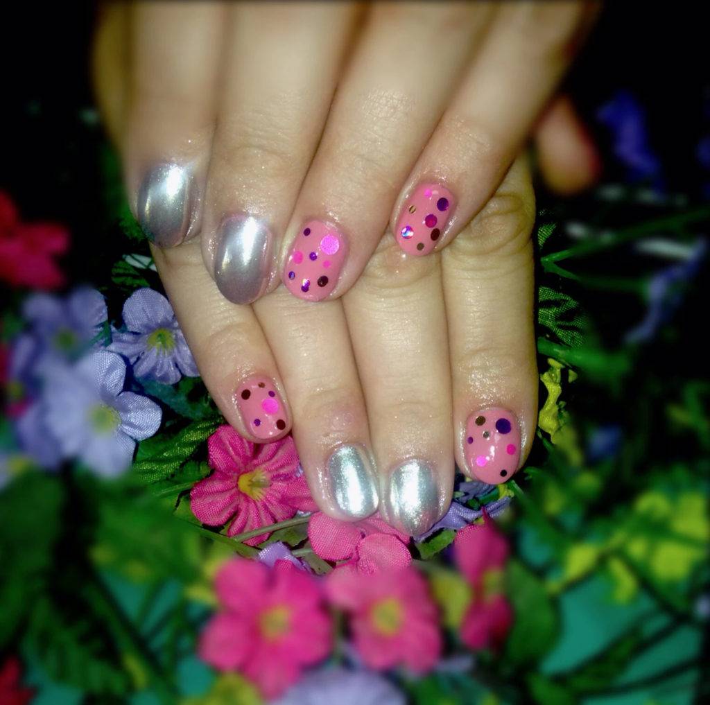 - дотс обмакнуть в обычный лак, а после сделать отпечаток на уже готовом гелиевом покрытии;