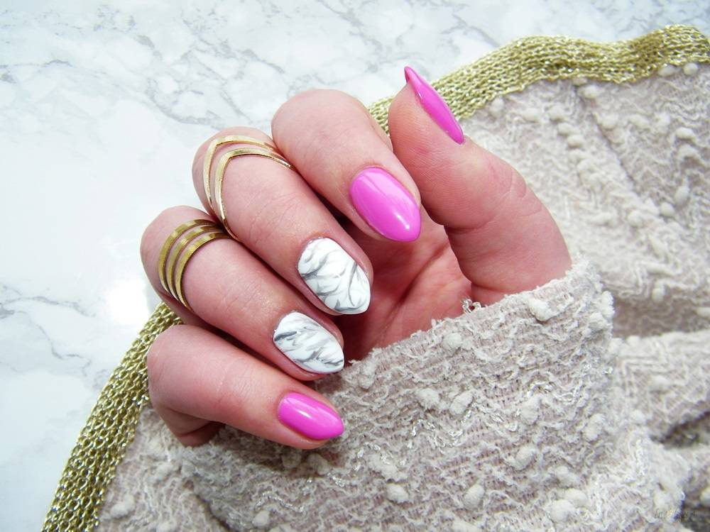 - Выигрышнее всего мраморный маникюр смотрится при смешении контрастных цветов: белого и чёрного, белого и серого, дымчатого и розового.