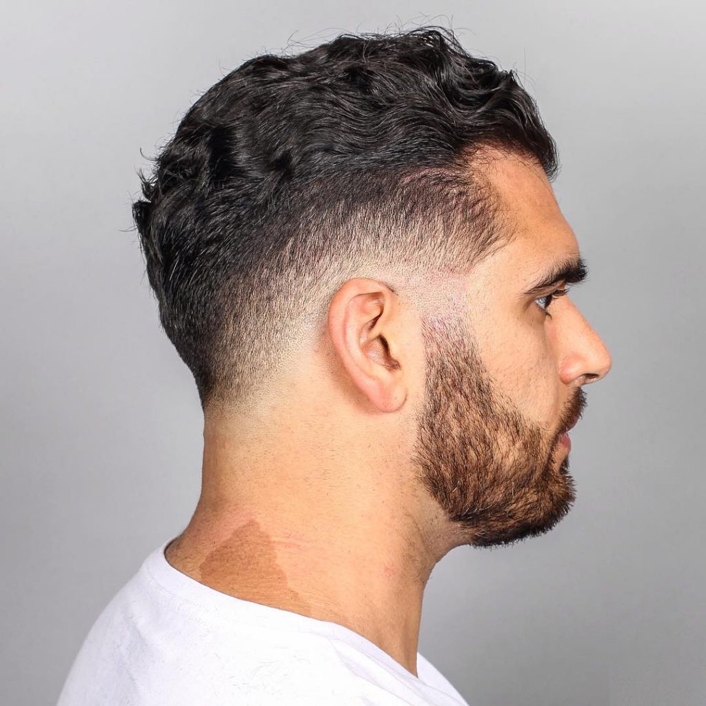 Фейд-кроп, англ. fade crop. Тут граница между затылком, висками и макушкой менее выраженная, как бы размытая. Это делает стрижку спокойнее, хотя оставляет немного бунта в образе;