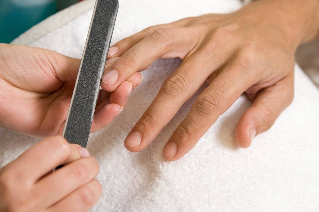 Мужской маникюр ограничен одной формой ногтя — прямой срез строго по подушечкам пальца. Для подпиливания лучше выбирать стеклянную пилочку, которая наиболее бережно действует на ноготь. Держать пилочку следует строго перпендикулярно и пилить в одном направлении. Двигать пилочкой в хаотичных направлениях нельзя. Это очень вредит структуре ногтя, способствует его дальнейшему расслаиванию.