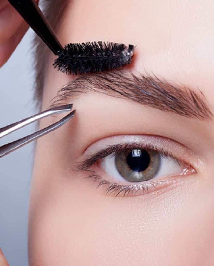 - Этап укладки и фиксации. С помощью специальных пинцетов предварительно обезжиренные волоски вытягиваются и укладываются по заданным линиям. После приглаживаются щеточками. После того как достигнута та форма, которая женщине нравится, волоски покрываются слоем прозрачного клея-фиксатора. Обычно это силиконовый клей на водной основе. Затем следует нанесение на брови размягчающего состава. После этого снова накладывается клеевой слой. Зафиксированные таким образом брови долго сохраняют форму, и волоски не выбиваются за линию роста.