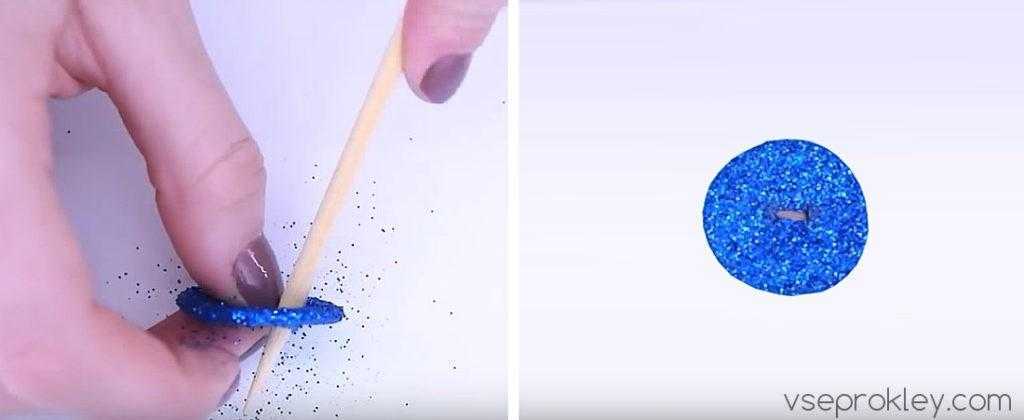 - Пока поделка не застыла, засыпьте клей сверху небольшим количеством блесток.