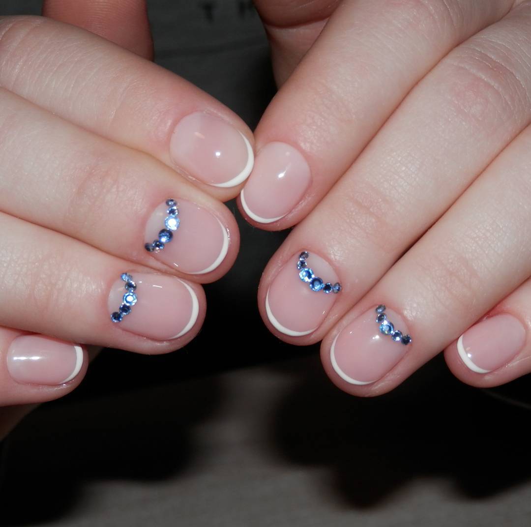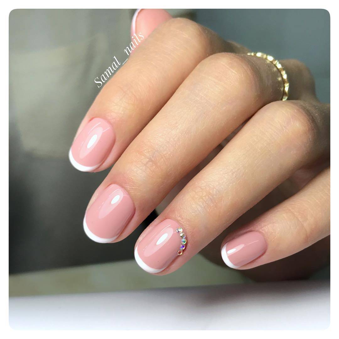 Короткий френч — замечательная основа для создания дополнительного декора. Красиво смотрится как простой классический френч со стразами, так и различные оттенки лака на кончиках ногтей.
