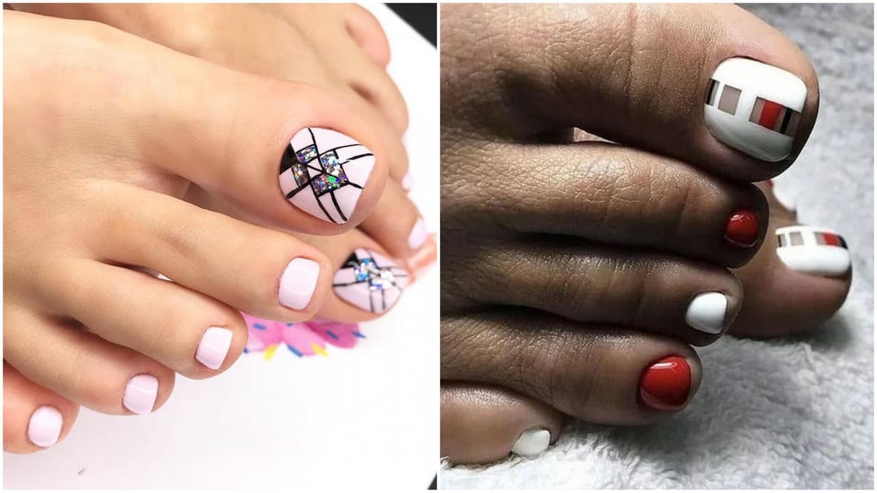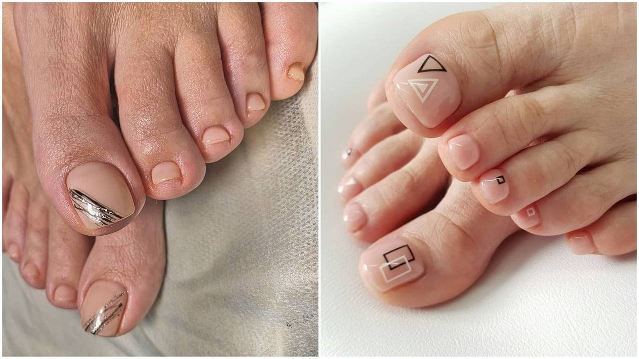 Лунный дизайн. Может показаться, что такой педикюр, наоборот, делает ногти визуально короче. Однако существует множество техник лунного педикюра, корректирующие небольшие пластины. Например, если добавить вертикальную линию по центру, ноготь будет казаться значительно длиннее.