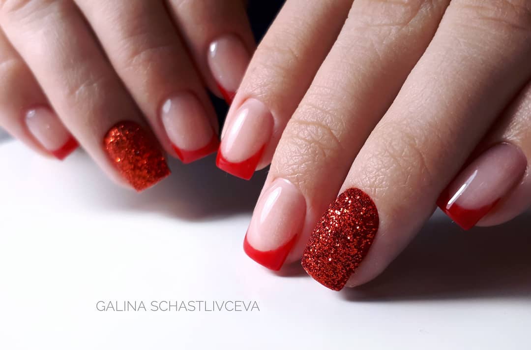 Маникюр с блеском — мелкие конфетти, стразы и блестки красиво дополняют дизайн коротких ногтей. Маленькая длина пластин делает блеск не таким вызывающим, как это смотрелось бы на длинных ноготках.
