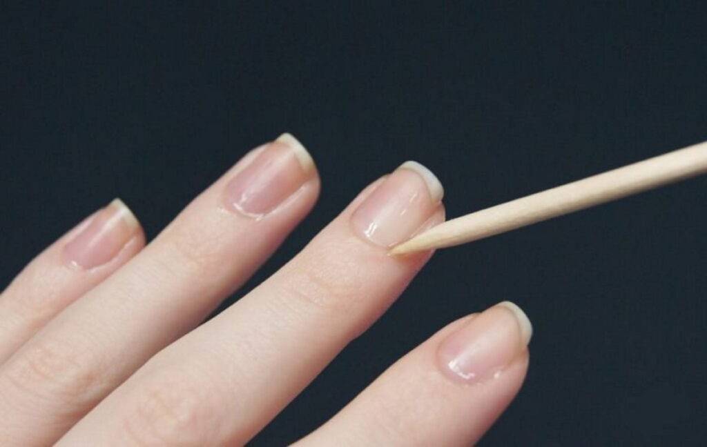 Деревянной палочкой со скошенным кончиком аккуратно удаляются остатки кутикулы. Для этого могут применяться особые пемзы, которые спиливают излишнюю кожу, но не задевают сам ноготь.