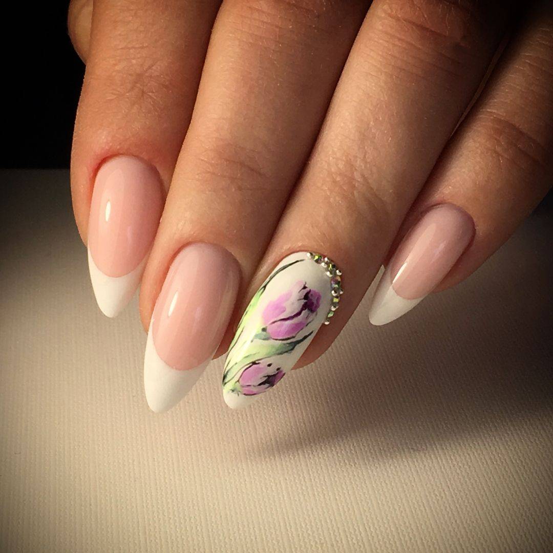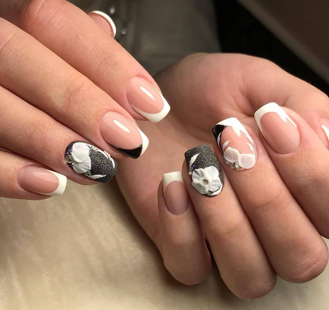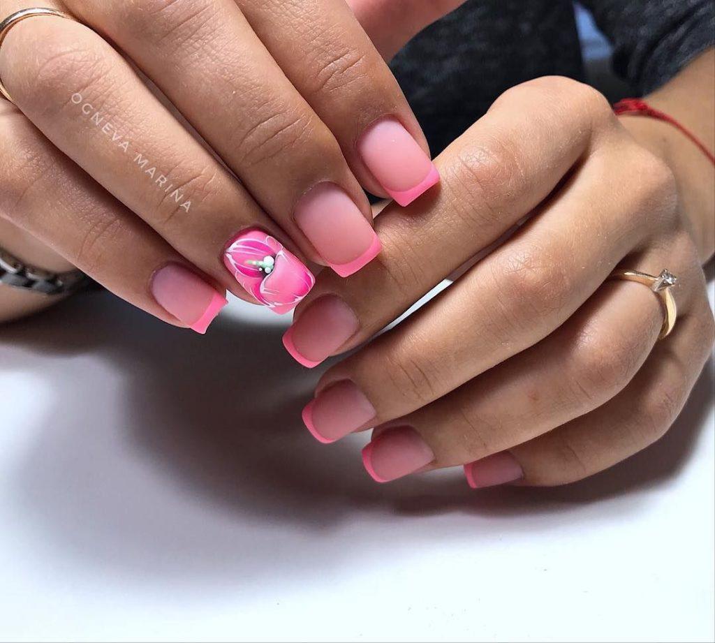 Крупные, яркие цветы – то, что нужно в весенне-летнем сезоне. Причем они могут быть в тон основному покрытию или же выступать в качестве акцента в маникюре. В любом случае французский маникюр с цветами придает образу особую элегантность.