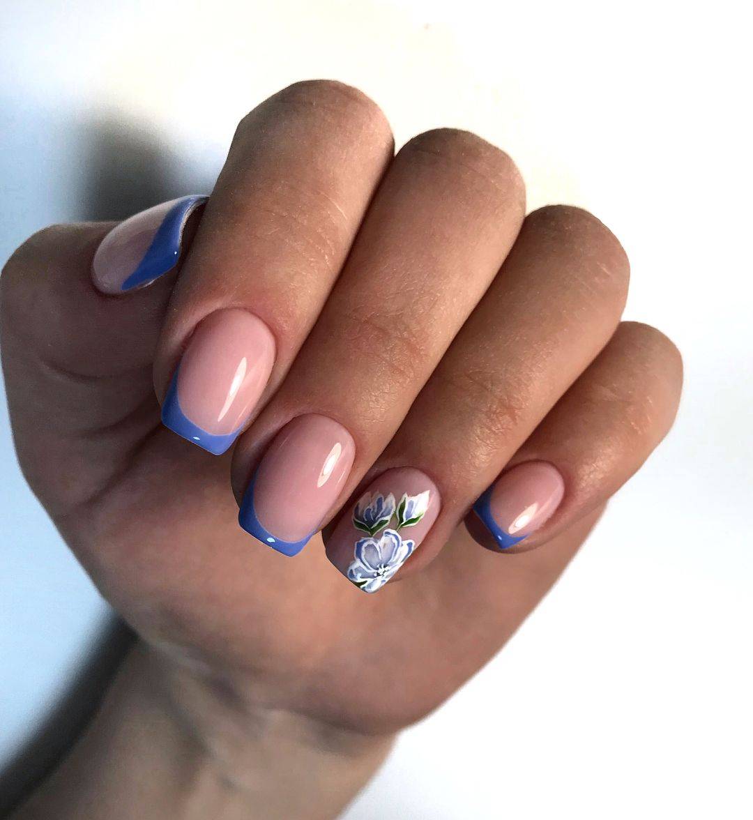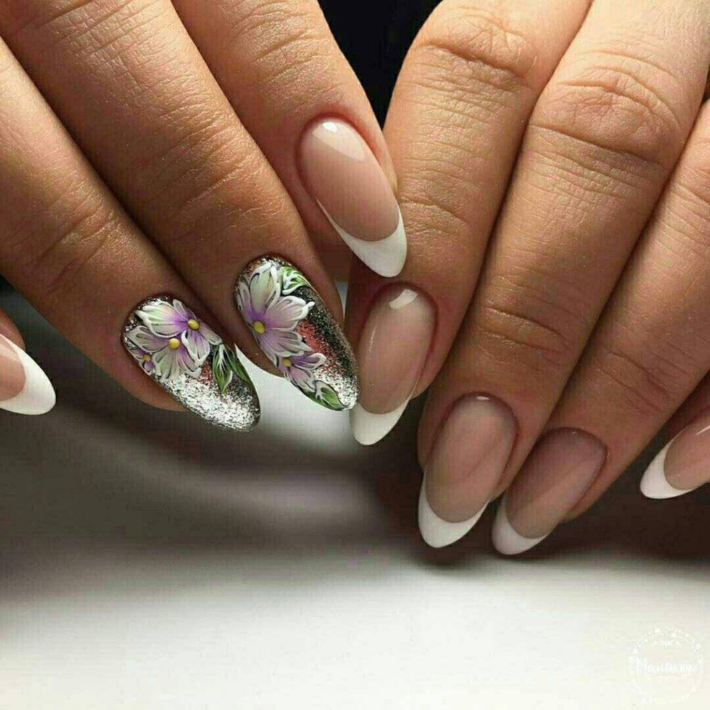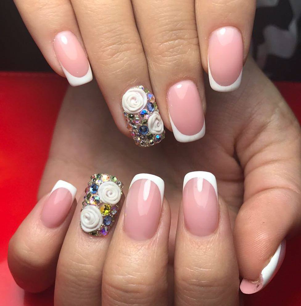 Крупные, яркие цветы – то, что нужно в весенне-летнем сезоне. Причем они могут быть в тон основному покрытию или же выступать в качестве акцента в маникюре. В любом случае французский маникюр с цветами придает образу особую элегантность.