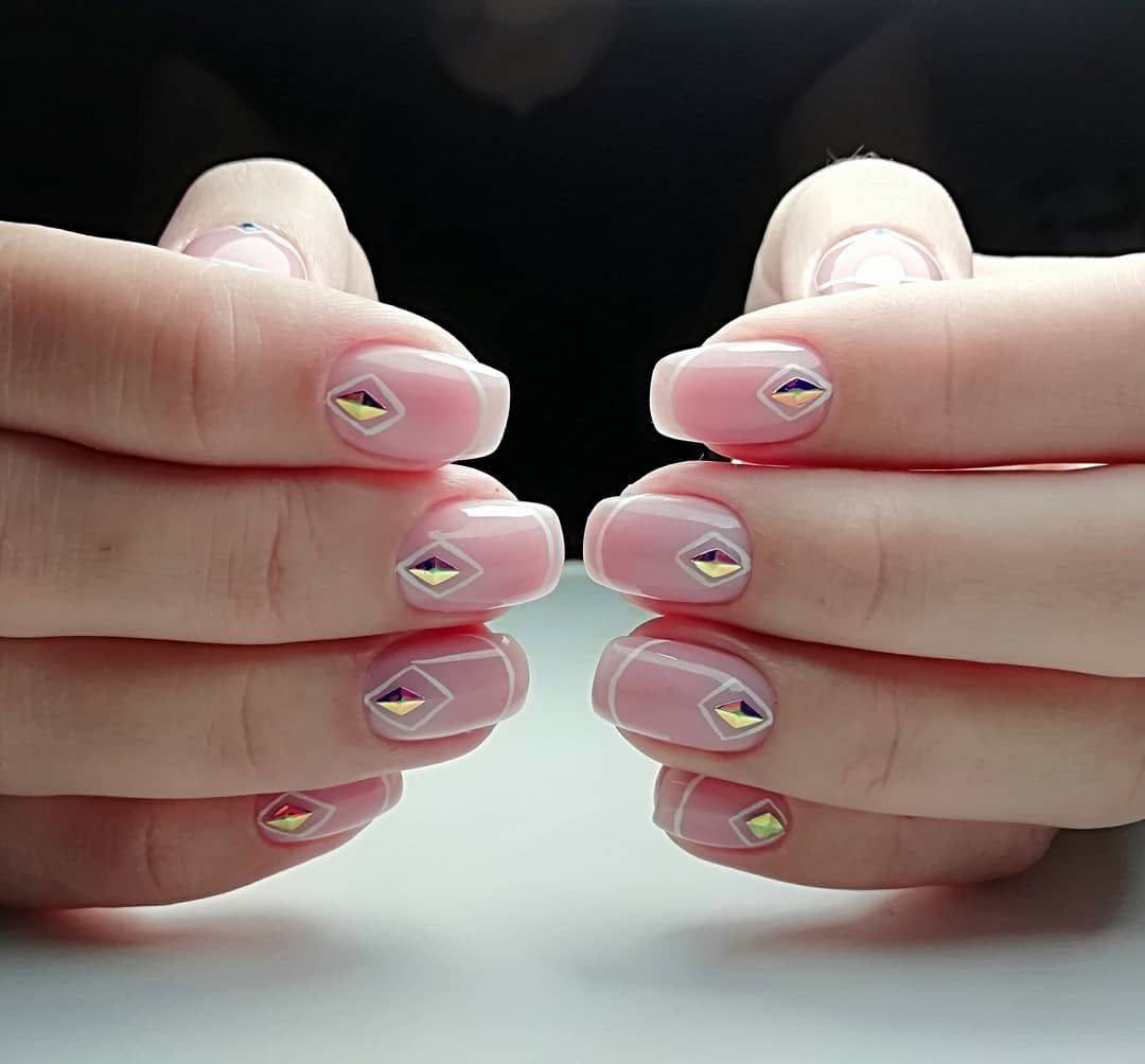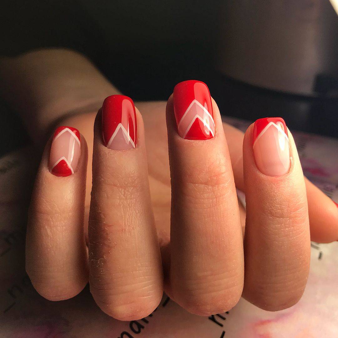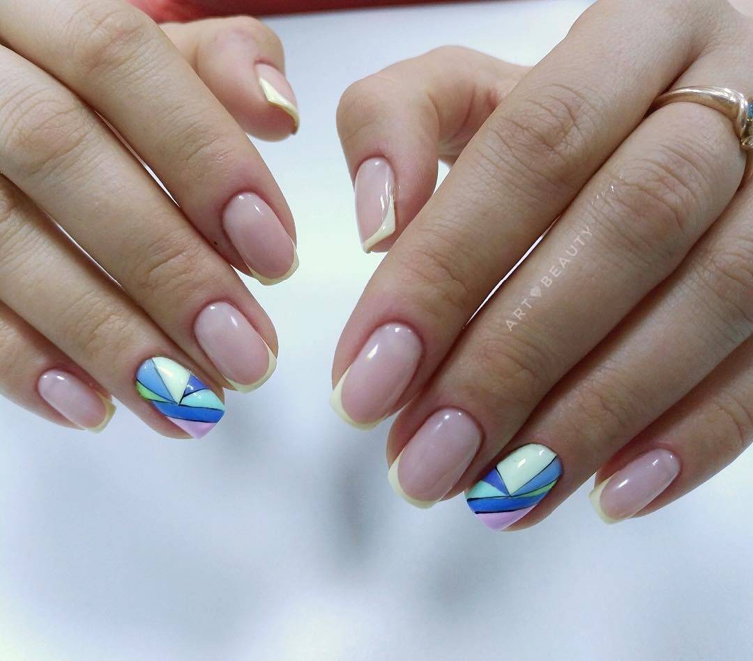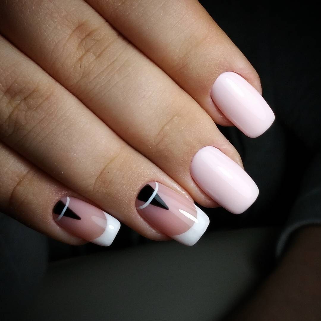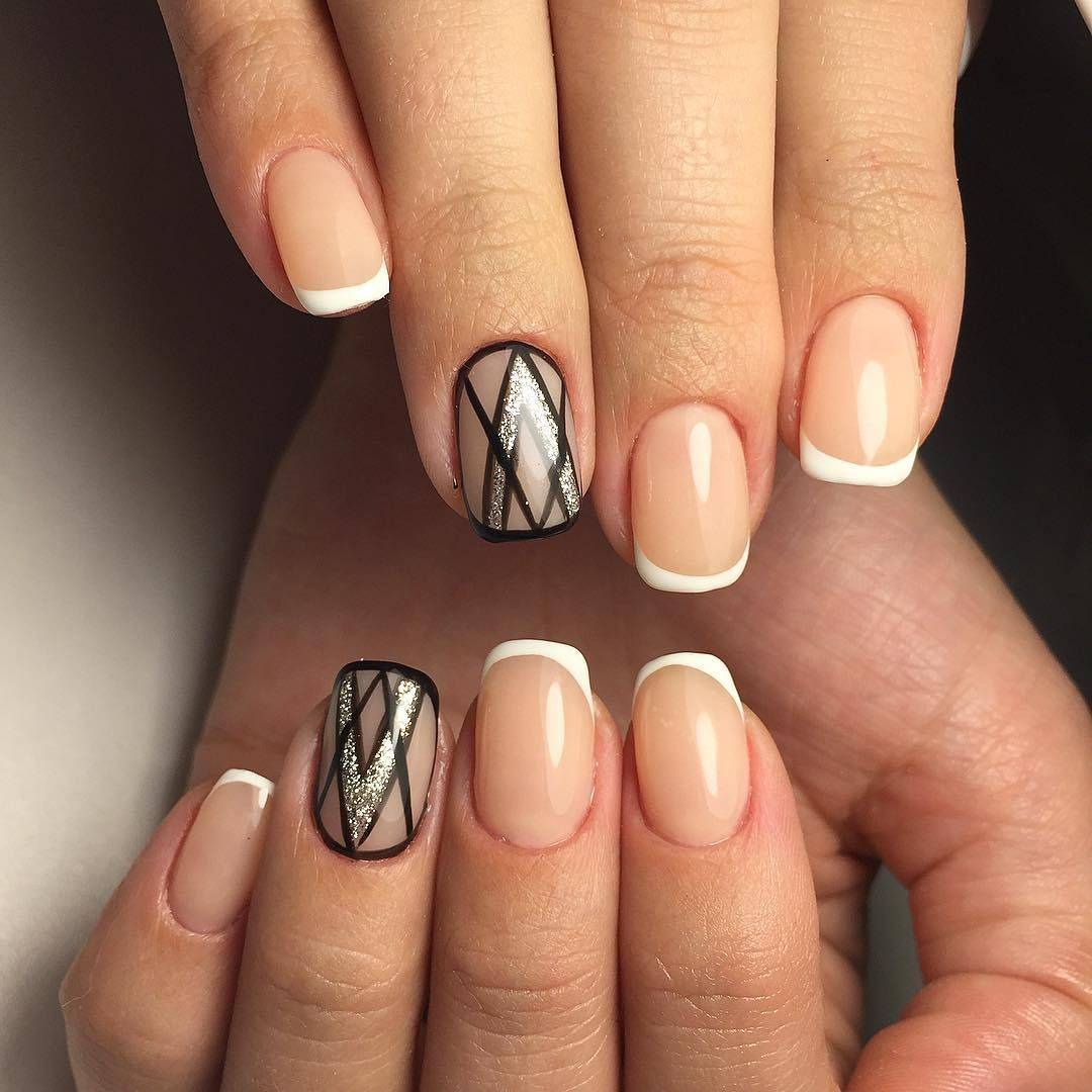 Геометрический рисунок уже длительное время входит в топ самых стильных видов дизайна ногтей. Он хорошо смотрится с френчем и делает его чуть более строгим, сдержанным. При желании его можно делать даже для рабочих будней. Но учитывайте, что в такой ситуации оттенки должны быть нейтральными.