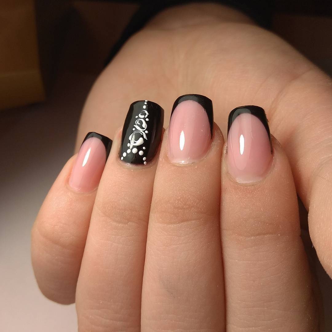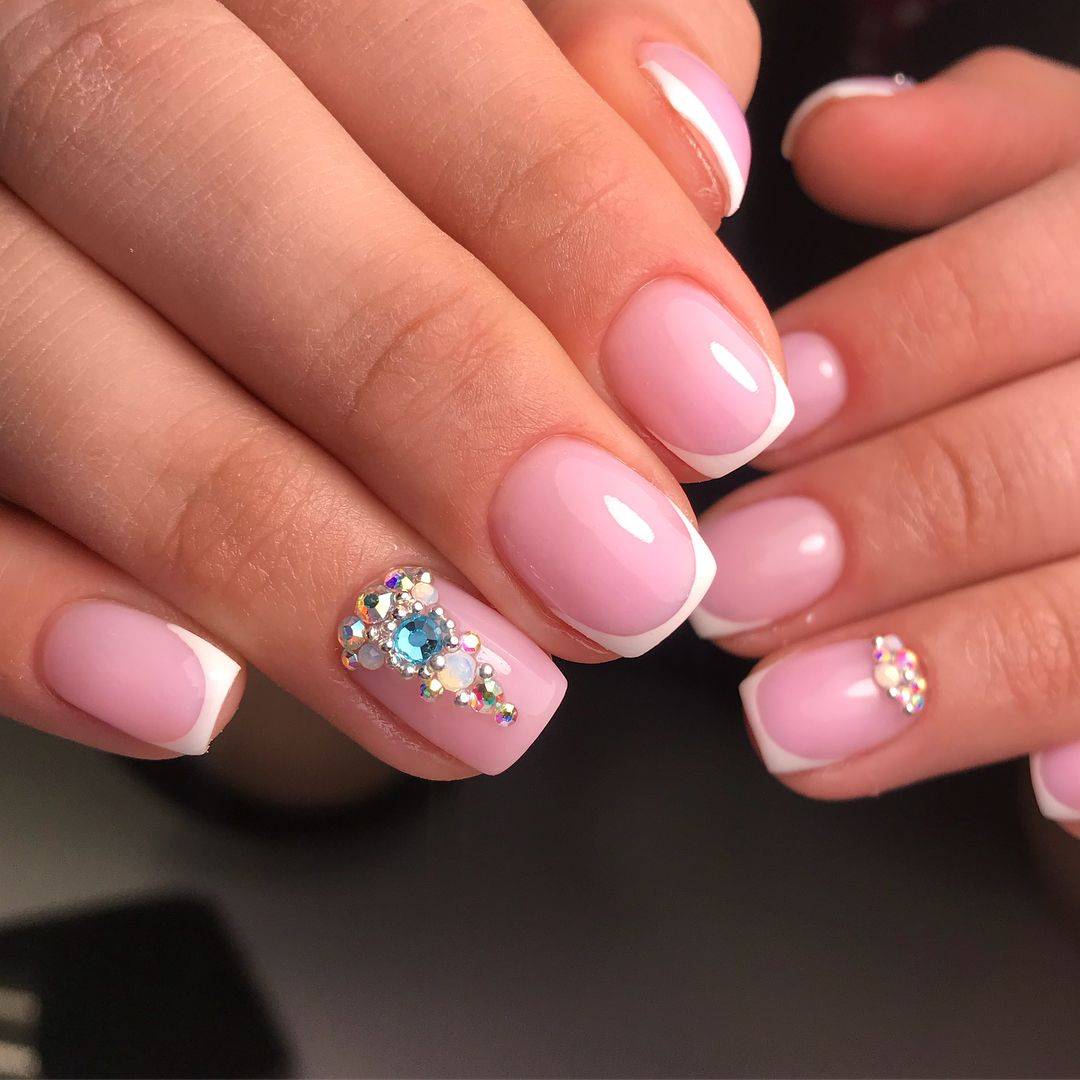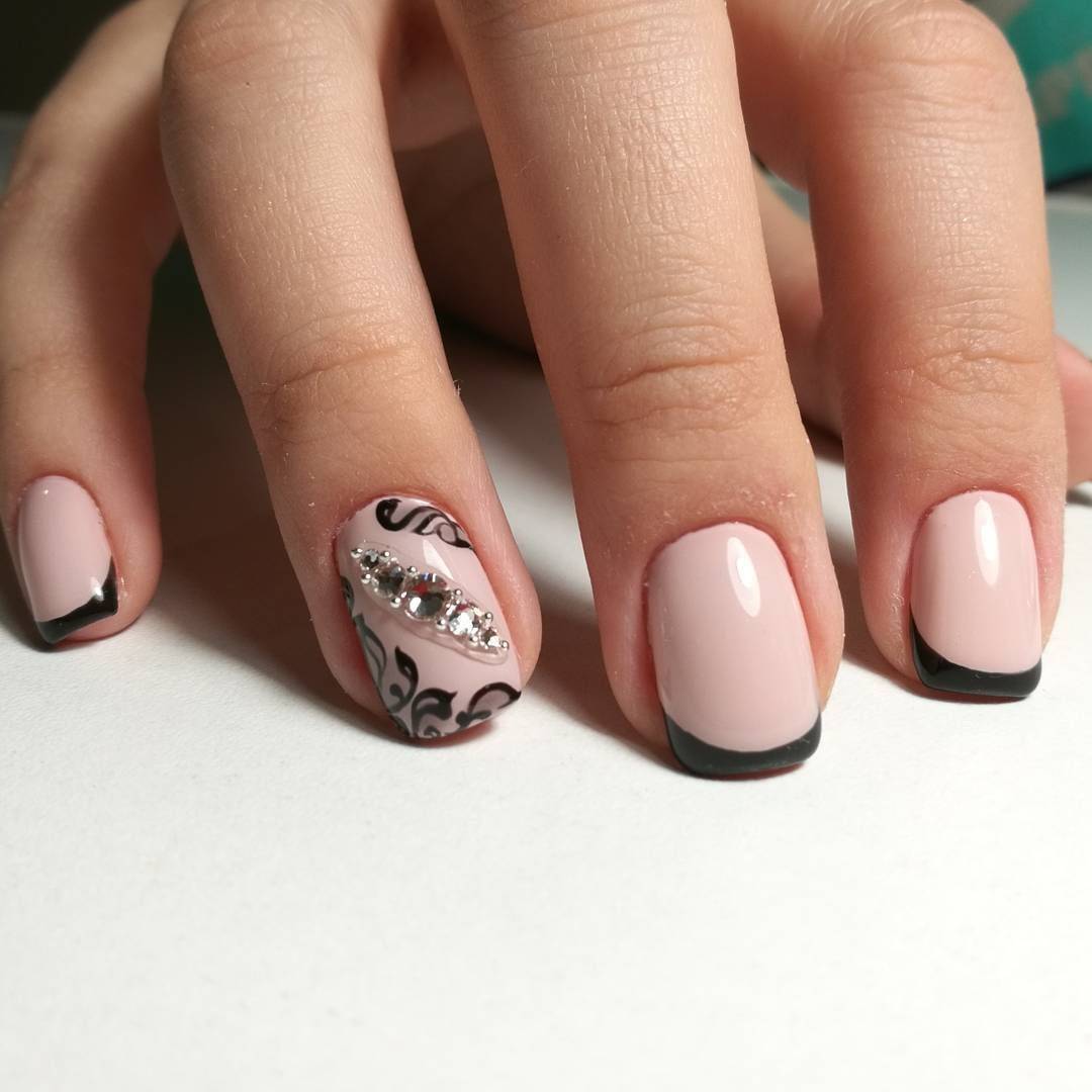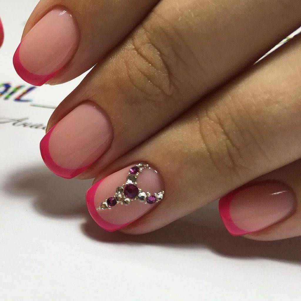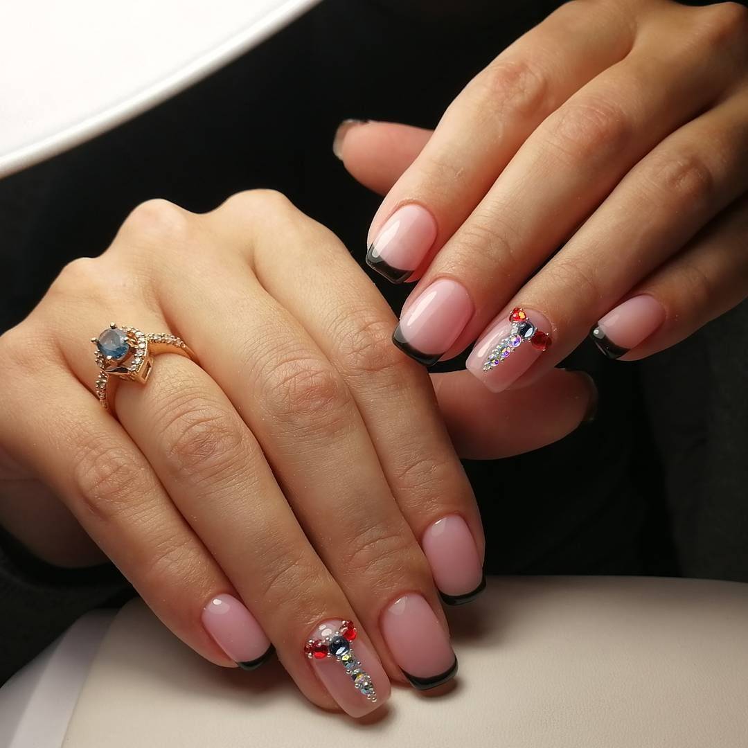 Что касается формы линии улыбки, то с ней также можно экспериментировать. Она не обязательно должна быть овальной. Все чаще девушки выбирают для себя треугольный, скошенный или же необычный вариант. От этого в целом зависит внешний вид и эффектность маникюра. Нередко для оформления дизайна используется дополнительный декор. Среди популярных вариантов стразы, блестки, бусинки, втирка, а также различные слайдеры и даже акриловая пудра. Все это помогает подчеркнуть оформление и сделать маникюр стильным.