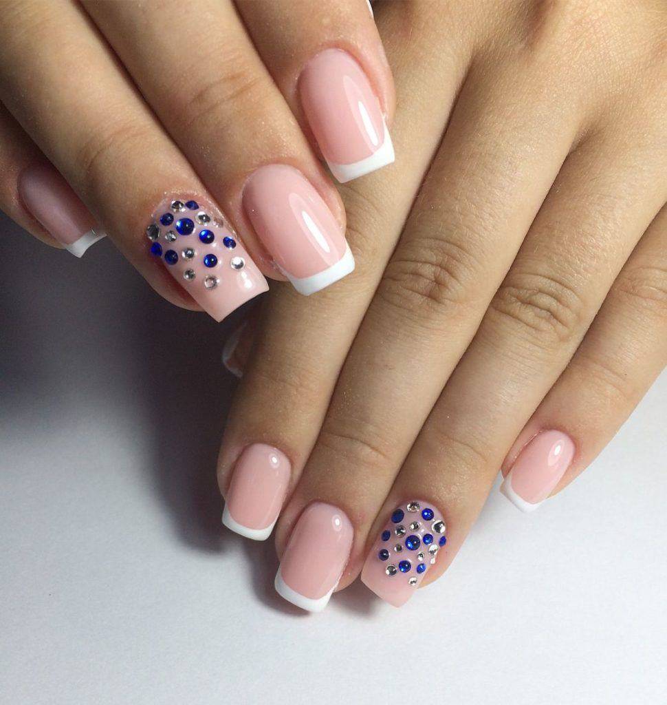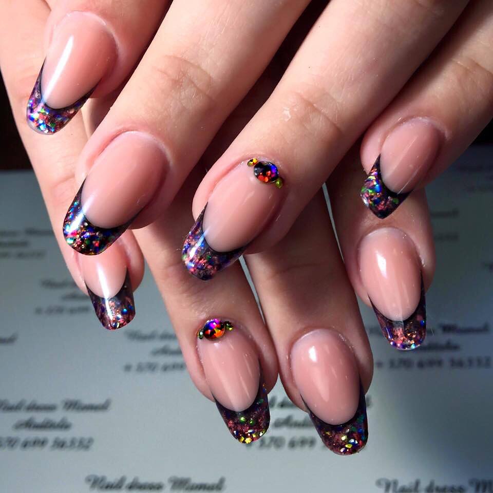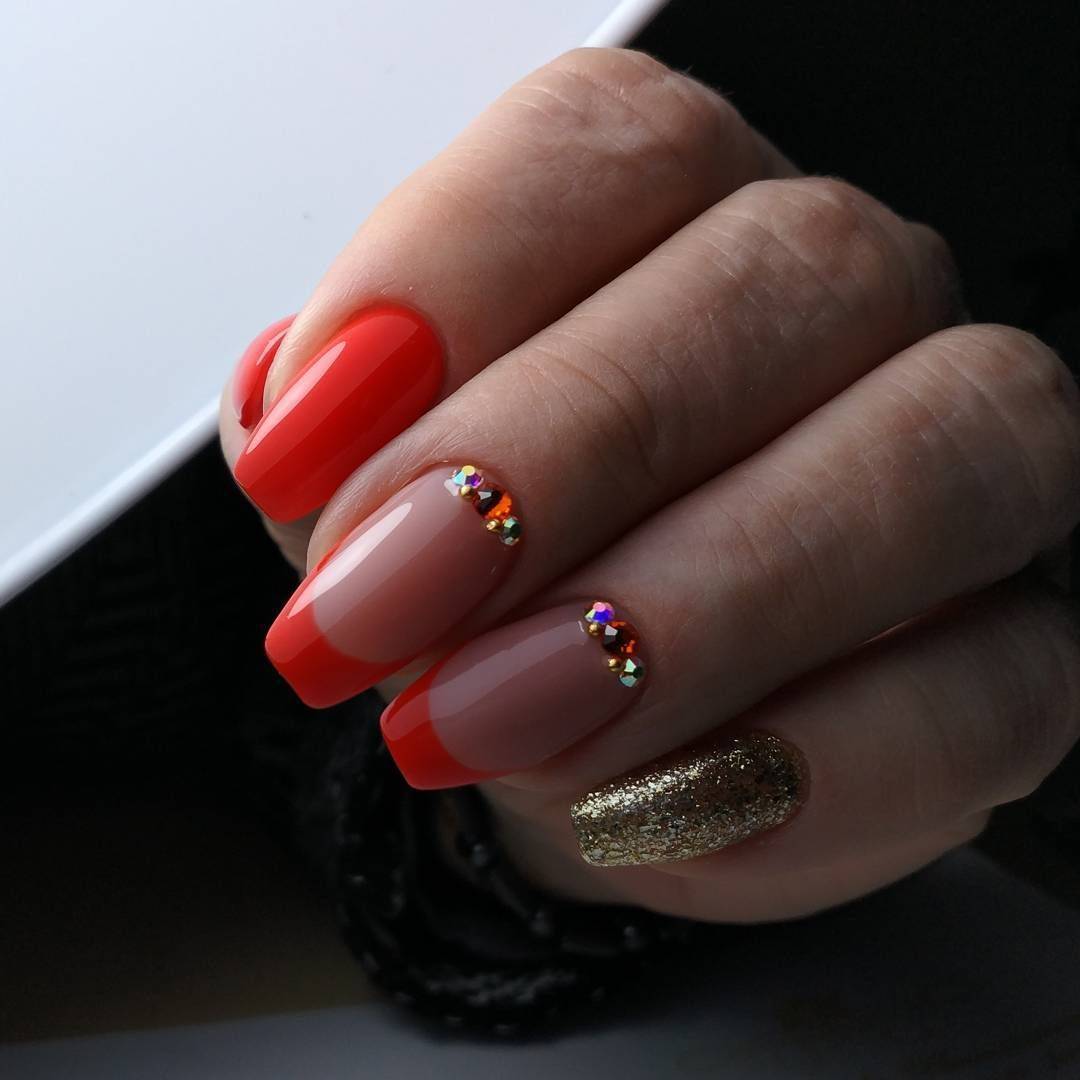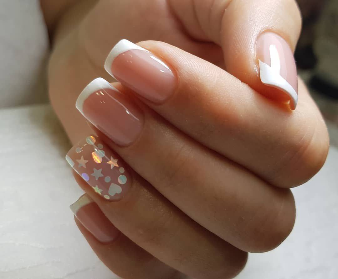 Что касается формы линии улыбки, то с ней также можно экспериментировать. Она не обязательно должна быть овальной. Все чаще девушки выбирают для себя треугольный, скошенный или же необычный вариант. От этого в целом зависит внешний вид и эффектность маникюра. Нередко для оформления дизайна используется дополнительный декор. Среди популярных вариантов стразы, блестки, бусинки, втирка, а также различные слайдеры и даже акриловая пудра. Все это помогает подчеркнуть оформление и сделать маникюр стильным.