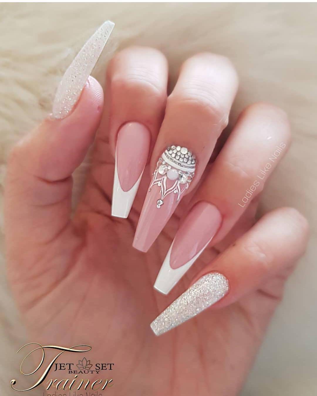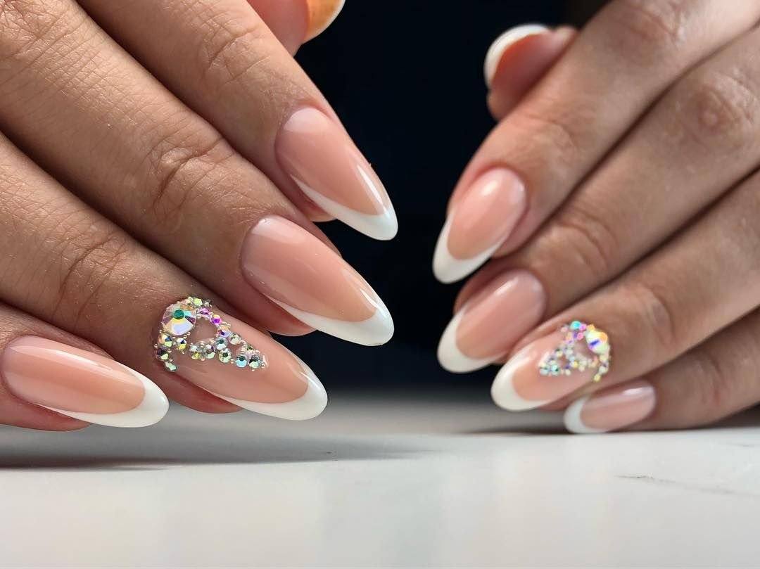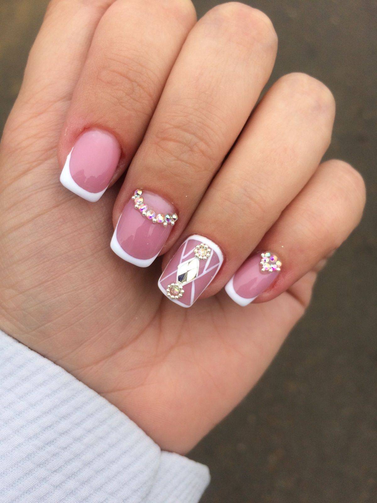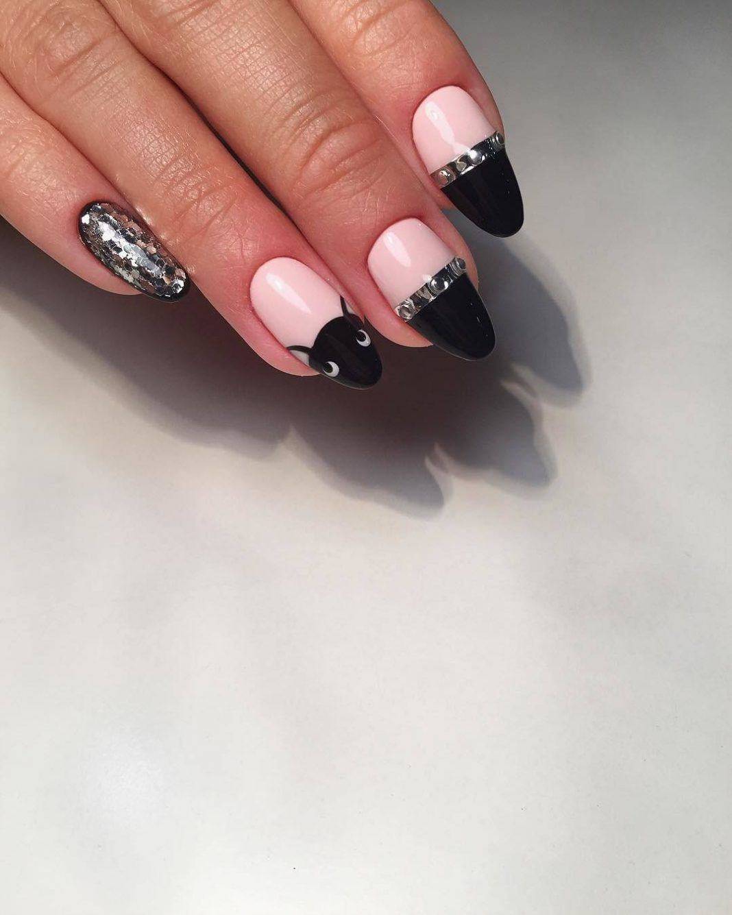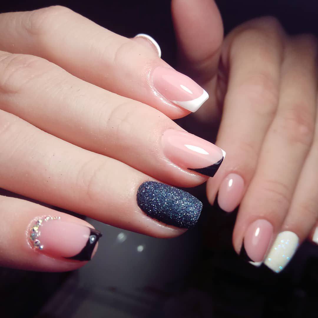 Что касается формы линии улыбки, то с ней также можно экспериментировать. Она не обязательно должна быть овальной. Все чаще девушки выбирают для себя треугольный, скошенный или же необычный вариант. От этого в целом зависит внешний вид и эффектность маникюра. Нередко для оформления дизайна используется дополнительный декор. Среди популярных вариантов стразы, блестки, бусинки, втирка, а также различные слайдеры и даже акриловая пудра. Все это помогает подчеркнуть оформление и сделать маникюр стильным.
