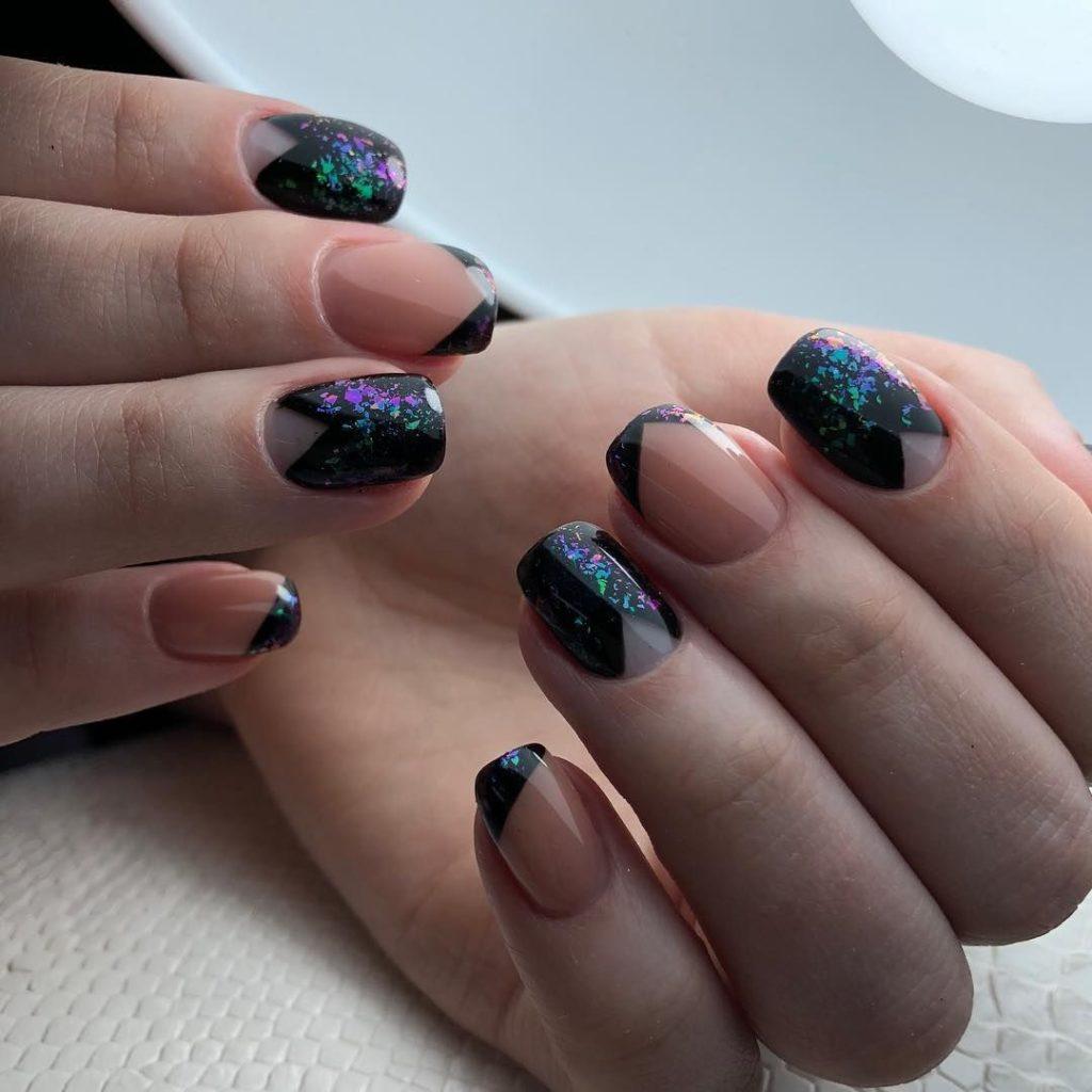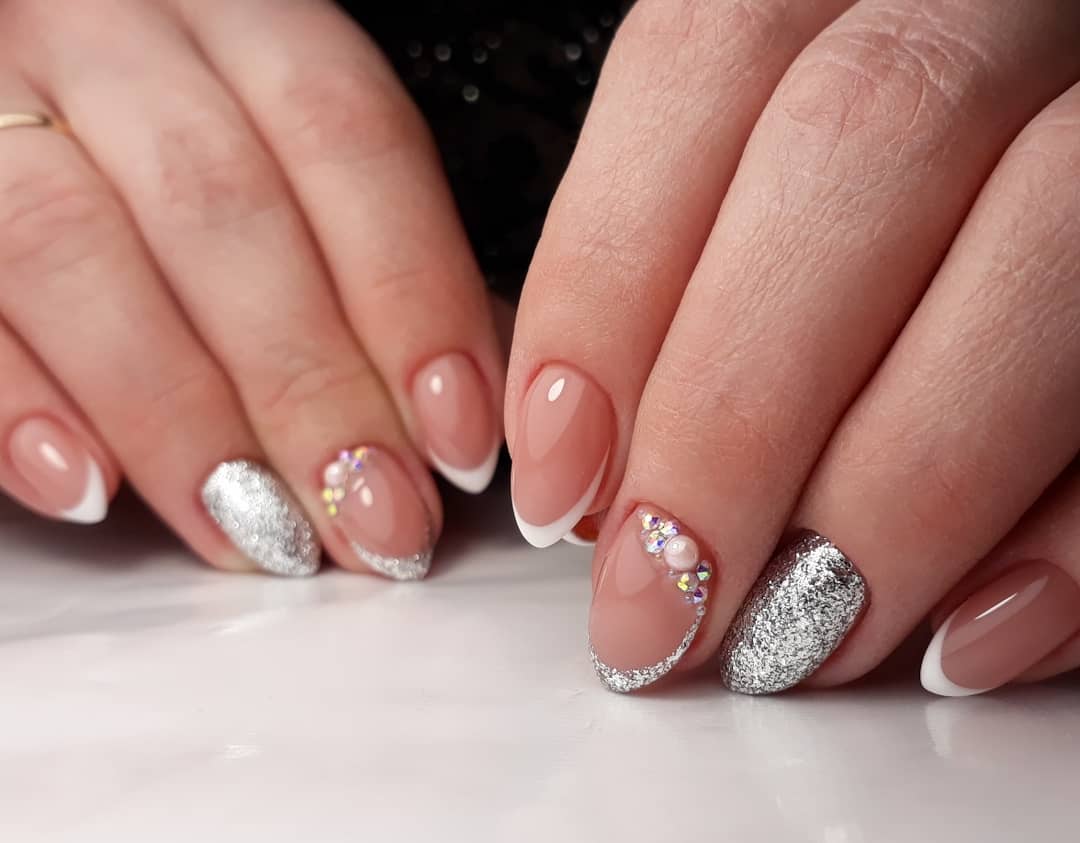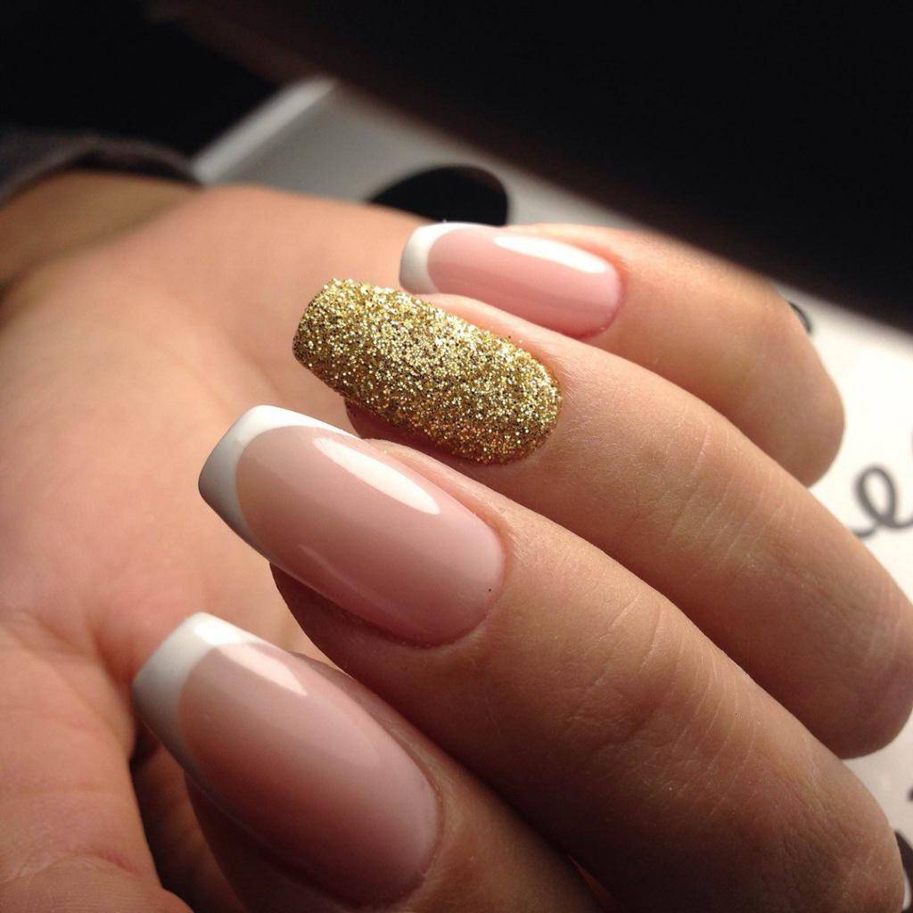 Для праздничного мероприятия можно выбрать еще более смелый вариант оформления – это френч с блестками. Именно их мастер наносит на линию улыбки вместо цветного или белого лака. За счет этого ноготки получаются максимально яркими. Смотрится это действительно необычно, но при этом современно. Но все же, стоит помнить о том, что в целом образ должен смотреться гармонично.