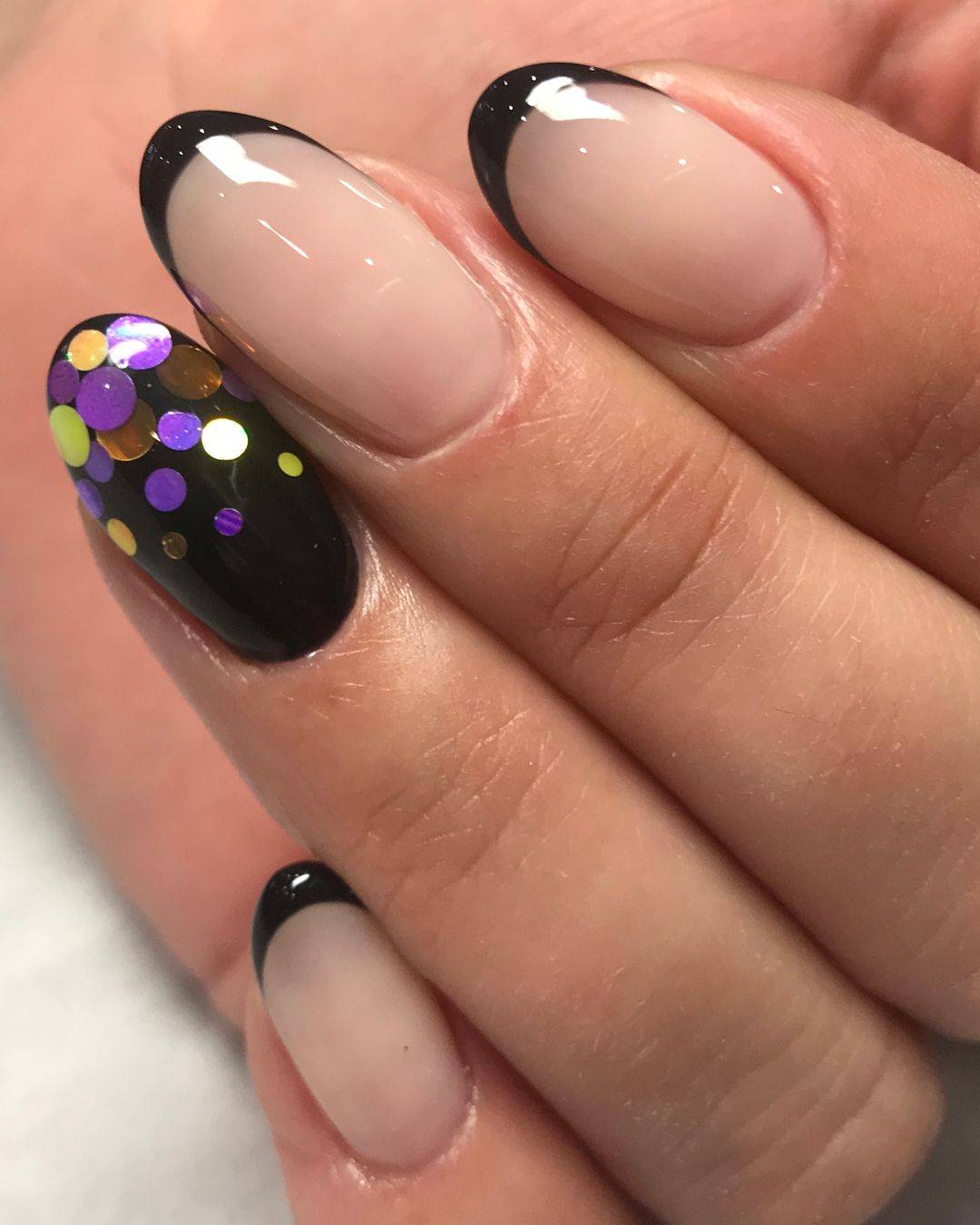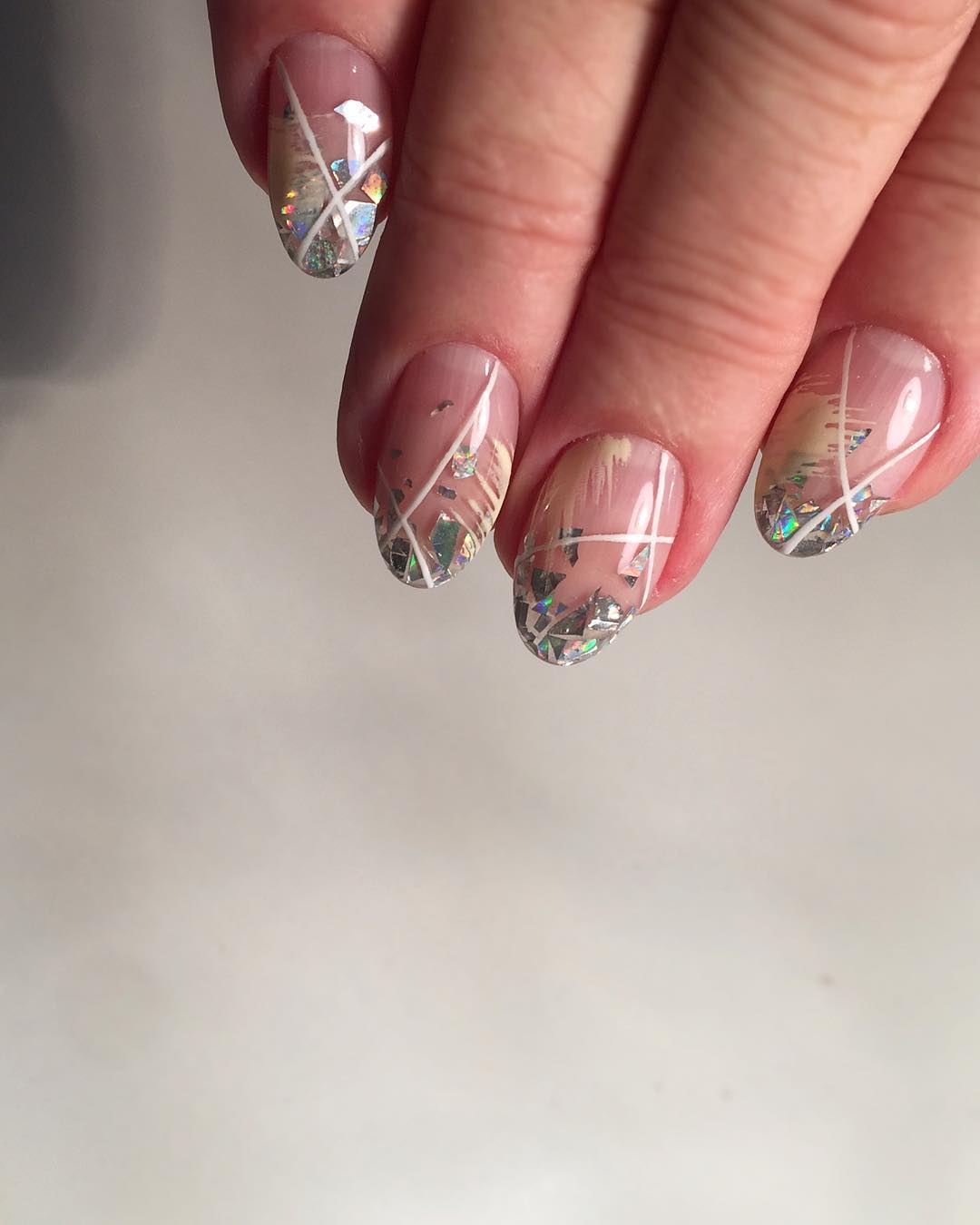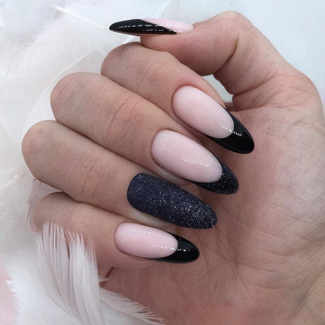 Для праздничного мероприятия можно выбрать еще более смелый вариант оформления – это френч с блестками. Именно их мастер наносит на линию улыбки вместо цветного или белого лака. За счет этого ноготки получаются максимально яркими. Смотрится это действительно необычно, но при этом современно. Но все же, стоит помнить о том, что в целом образ должен смотреться гармонично.