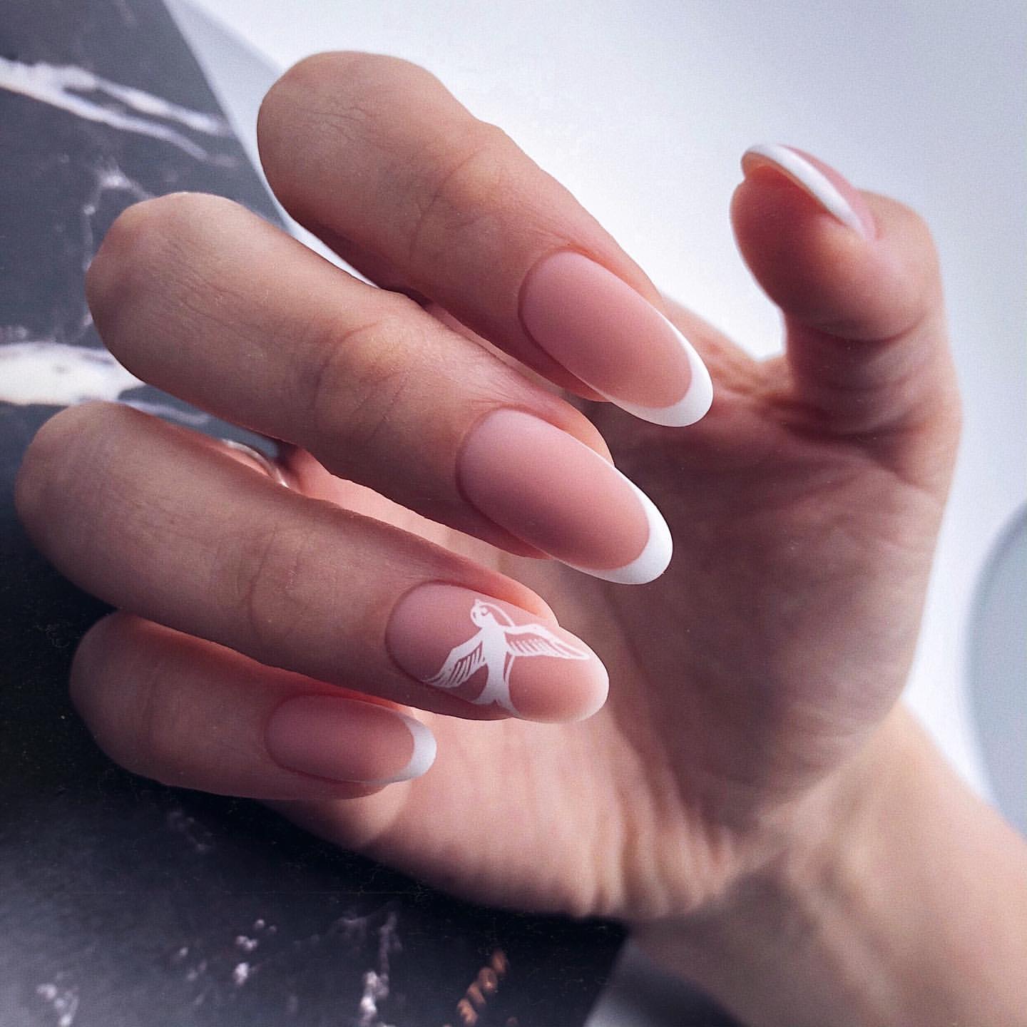 Сделать французский маникюр необычным, можно не только меняя направленность линии улыбки. Смело дополняйте дизайн рисунком, который отразит ваше виденье прекрасного.