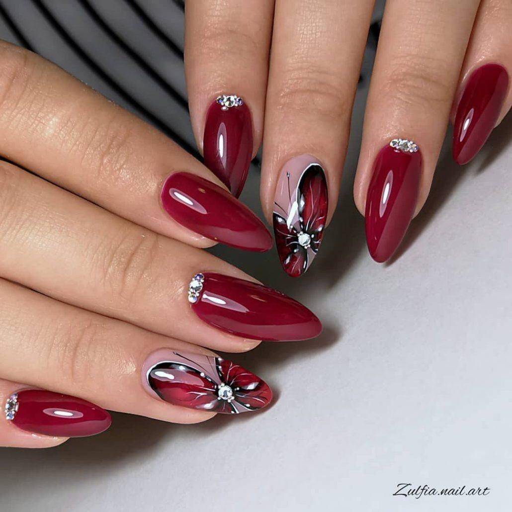 Декор для длинных ногтей подбирается исходя из основного оттенка, сезона и тематики нейл-арта. Одинаково красиво на длинных ногтях выглядит геометрия, ажурные узоры, дымка, выкладка стразами и т.д. Что касается флористики, то акцент сместился с ярких слайдеров на утонченные узоры в темном цвете с бутонами и листочками. Также красиво смотрится флористика с помощью аэрографии. Узор получается нежным и плавным.
