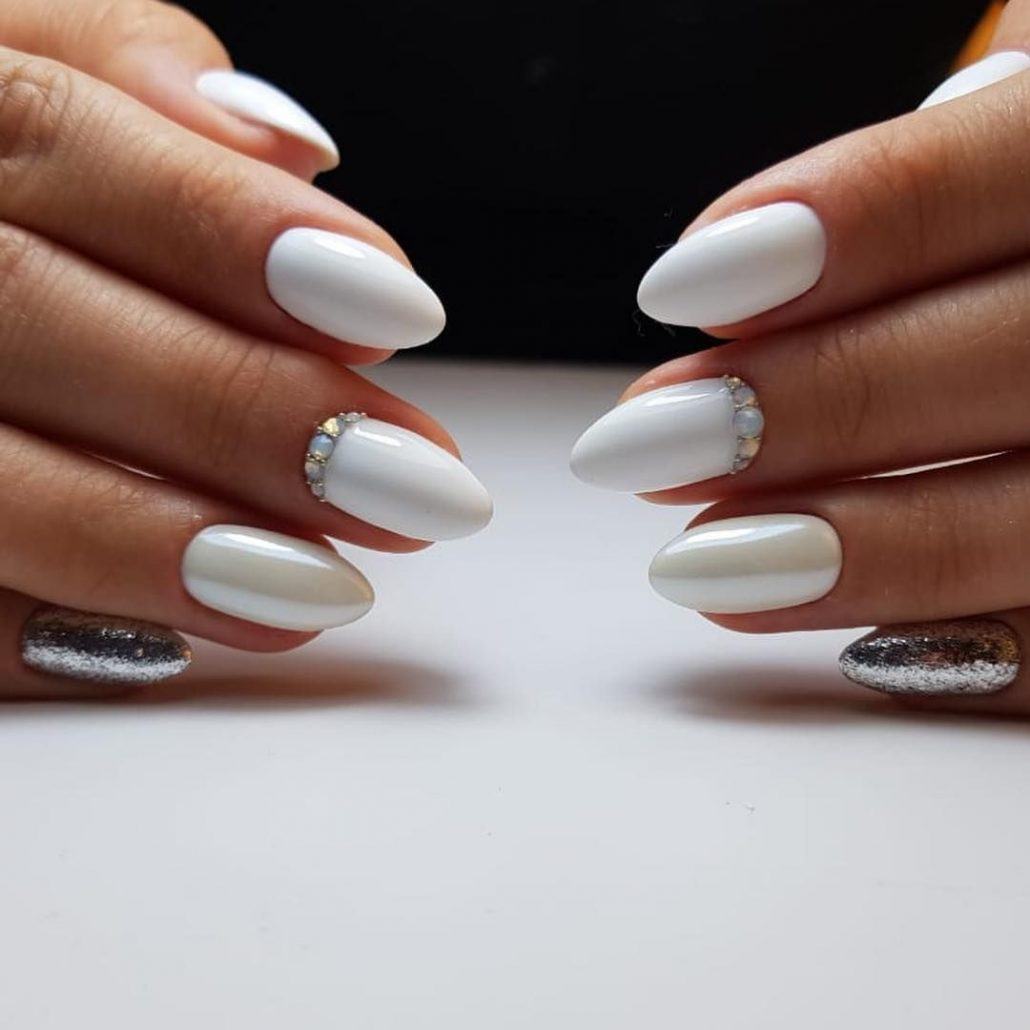 Они позволяют создать однородное сплошное покрытие без «пустых» мест. При желании можно дополнить белый маникюр небольшим количеством стразов или бульонок. Основная задача мастера – показать нежность и красоту молочного цвета, не затеняя его декором.