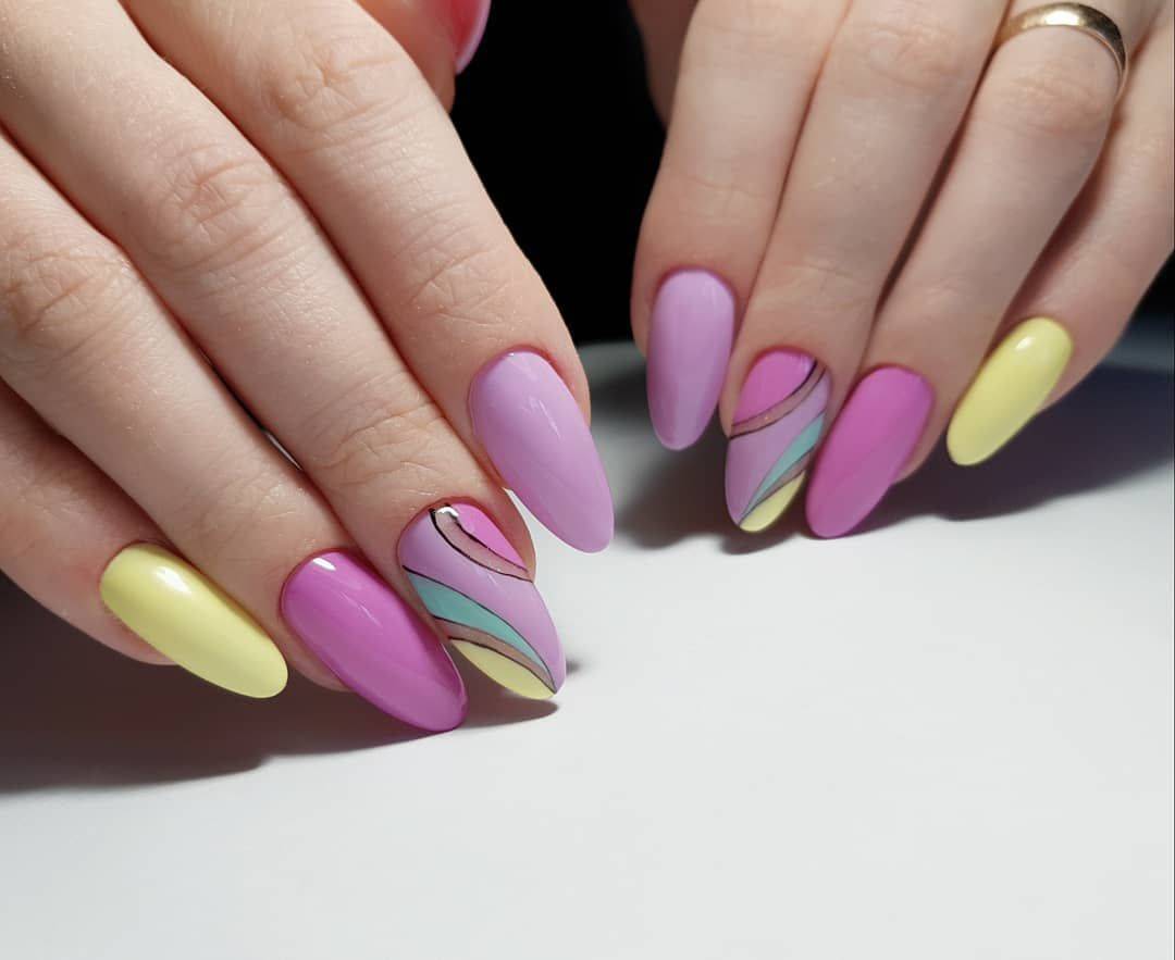 Для весеннего маникюра используйте технику разноцветный маникюр, маникюр “разные ручки”, 2-х цветный маникюр. Для маникюра используются мягкие яркие оттенки, которые еще нежнее смотрятся в матовом варианте. В тренде разноцветный маникюр, где на каждом ноготке используется отдельный цвет. Такой дизайн создается не только на основе личных предпочтений, но и с учетом цветового круга и гармоничности оттенков.