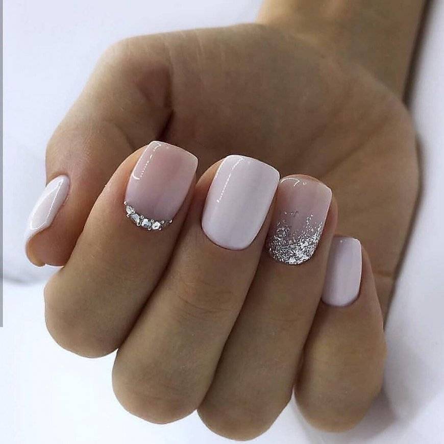 Как вариант французского маникюра омбре – очень эффектный дизайн. Плавные переходы бежевых оттенков в белый смотрятся красиво и легко. Пастельные оттенки голубого в ансамбле со стразами – это основа минималистичного свадебного маникюра.