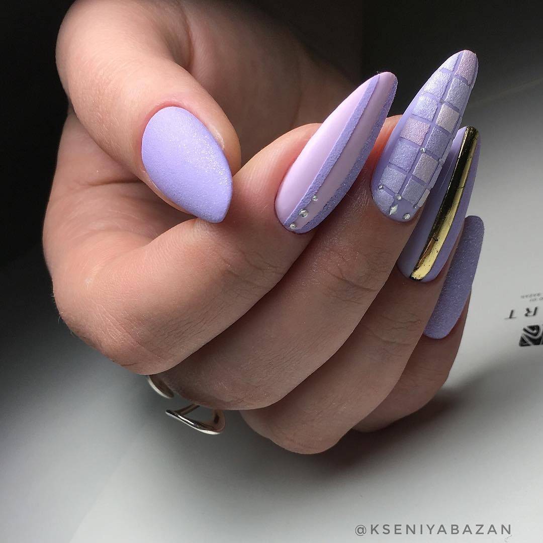Помимо этого, акцент на лунку сохранил свой классический вид: белая окантовка по основанию ногтя, но база изменилась. Теперь подбираются нежные холодные оттенки с добавлением крупного и мелкого блестящего декора.