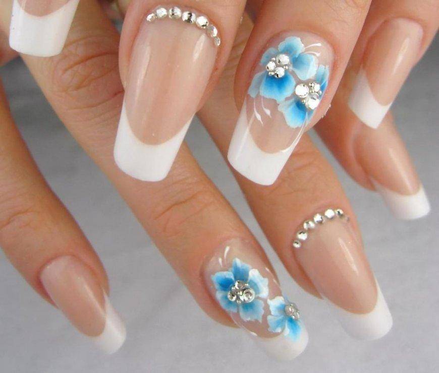 Голубой или синий маникюр для невесты. Как говорилось ранее, многие девушки уходят от стандартов и отдают предпочтение индивидуальности. Поэтому маникюр на свадьбу может быть выполнен в яркой цветовой гамме. Очень популярен в этом сезоне голубой и синий цвет. Эти оттенки можно смешать между собой или же использовать по отдельности, дополняя результат подходящими декоративными элементами.