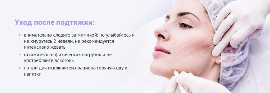 После подтяжки внимательно следите за мимикой. Специалисты советуют не улыбаться и не хмуриться 2 недели. Интенсивно жевать тоже не рекомендуется. Откажитесь от физических нагрузок, не употребляйте алкоголь и не ходите в места, где очень жарко, например, в баню. На три дня исключите из рациона горячую еду и напитки.