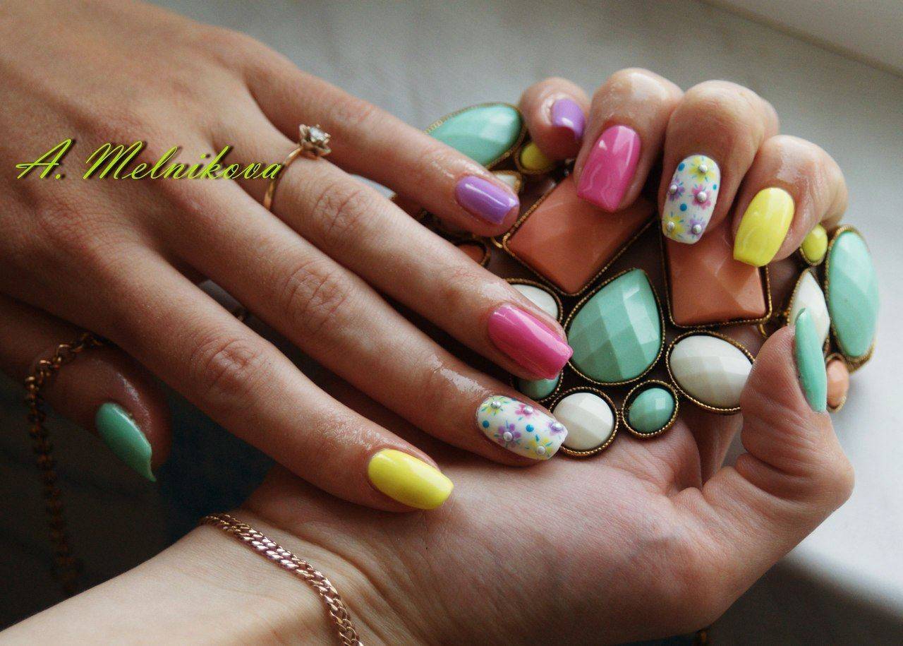 Для более неформальных торжеств допустимо смешение стилей и тематик. Наращенные ногти являются прекрасной основой для пестрых покрытий и обильного декорирования.